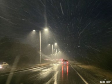Водители говорят, что пока не сильно скользко, но уже сложновато ехать, и видимость плохая.Подпишись на NewsVL.ru