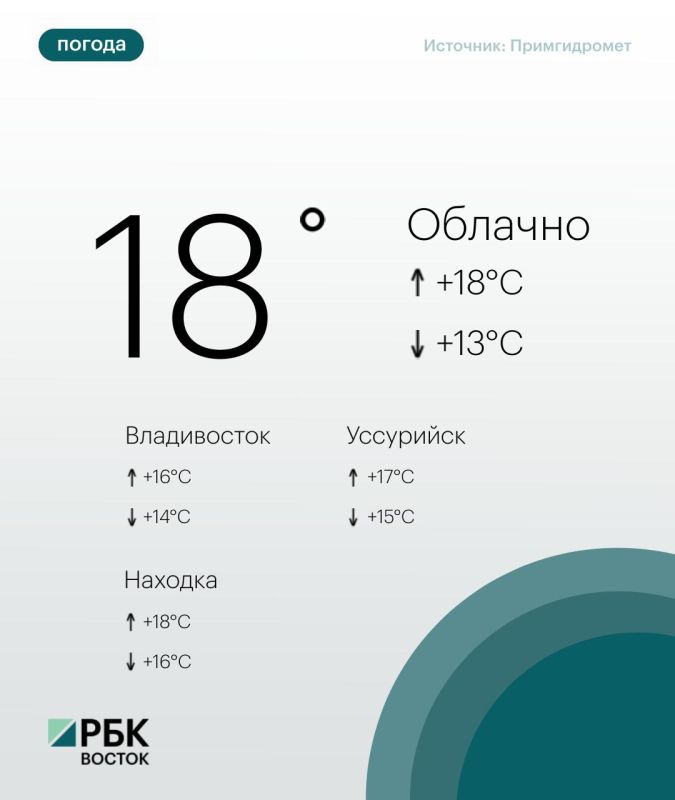 Без осадков. Ветер утром и днем южный умеренный. Температура воздуха +13...+18°С Во Владивостоке переменная облачность, без осадков. Ветер южный умеренный до сильного, в конце дня сильный. Температура воздуха +14...+16°C.Подписывайтесь на РБК...