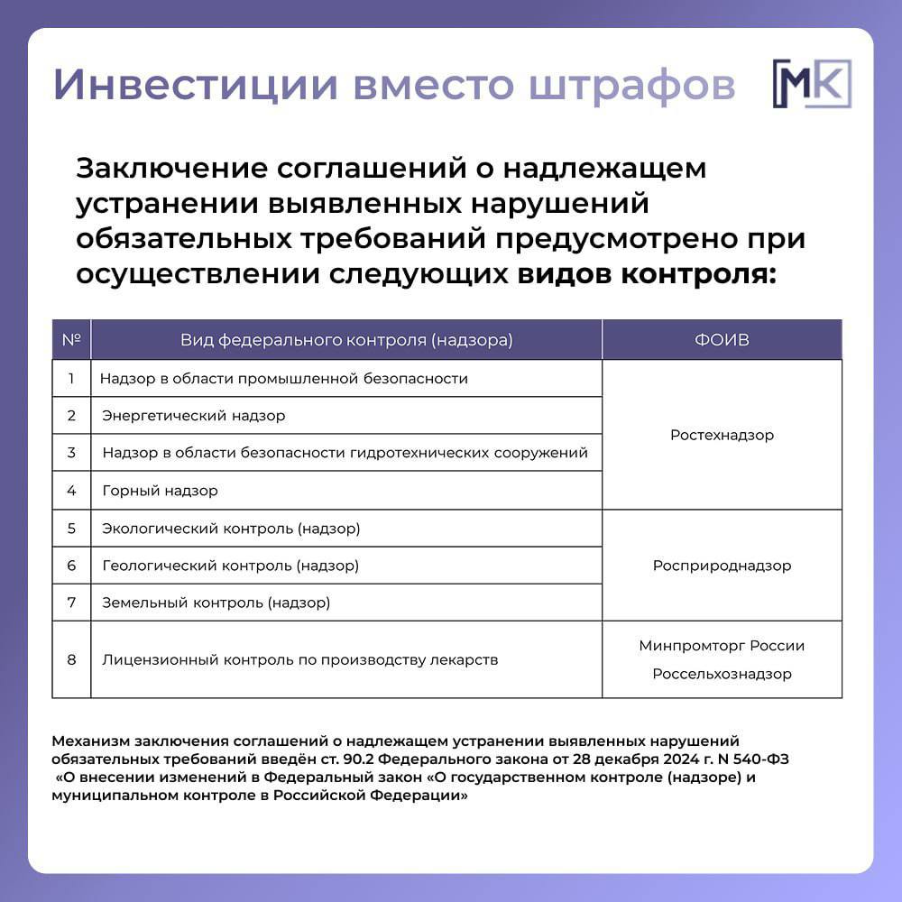 Механизм «инвестиции вместо штрафов» позволит избежать рисков социальной нестабильности, если проверки будут угрожать остановкой предприятий, а также предоставит возможность исправить нарушение путем инвестиций в собственное развитие.