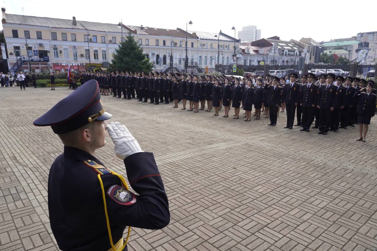 Со знаменательным событием в их жизни курсантов поздравил начальник Дальневосточного юридического института МВД России генерал-майор полиции Александр Буховец: «Вы встали на путь, требующий мужества, самоотверженности и несгибаемой воли. Ваш осознанный выбор профессии достоин уважения, ведь служба в органах внутренних дел требует стойкости, терпения и полной самоотдачи». Отдельные слова благодарности Александр Владимирович выразил родителям, воспитавшим настоящих патриотов.Молодые полицейские торжественными словами Присяги подтвердили свой осознанный выбор, смыслом которого является беззаветное служение людям и Отечеству.