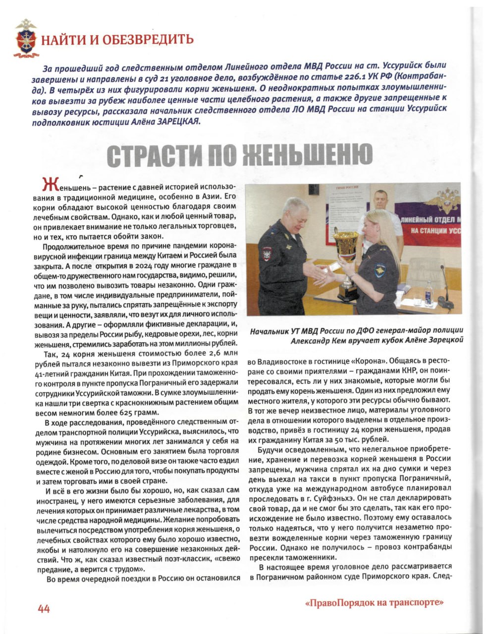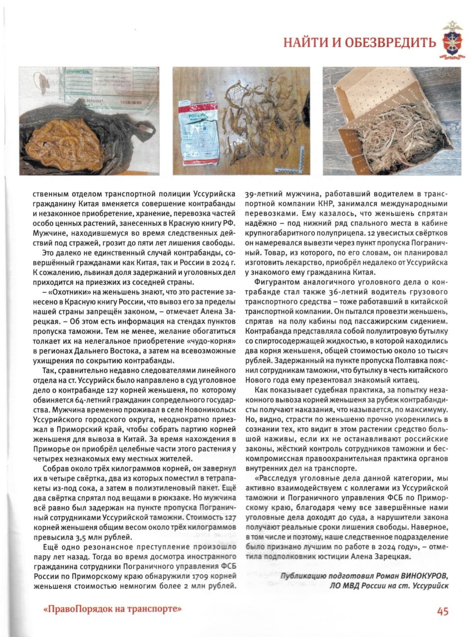 В статье журнала «ПравоПорядок на транспорте» рассказываем о том, как сотрудники транспортной полиции Уссурийска вместе с таможенниками и пограничниками успешно раскрывают дерзкие схемы контрабанды женьшеня.