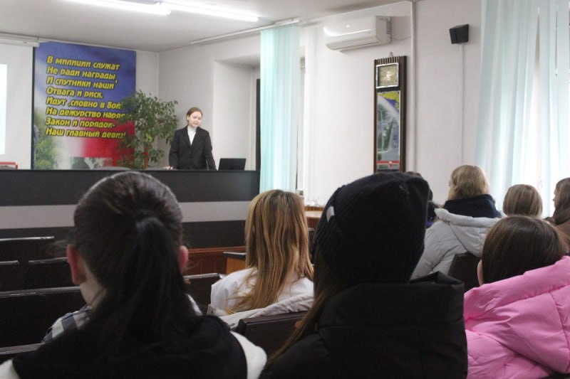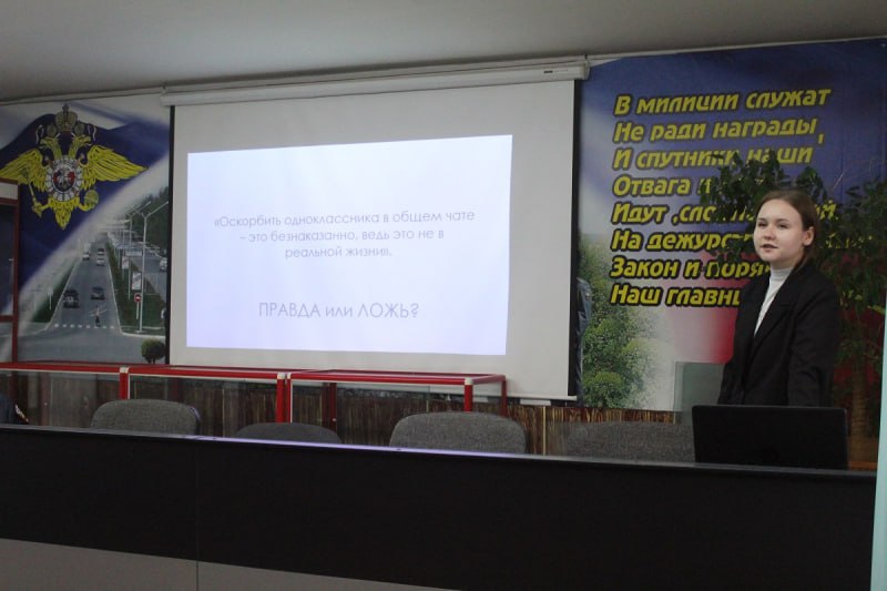В актовом зале отдела МВД России «Пожарский» стажер по должности юристконсульта правовой группы Анастасия Поповская в игровой форме провела квиз-викторину «От шалости до преступлений: где проходит грань?» для учеников полицейского класса средней образовательной школы № 2.