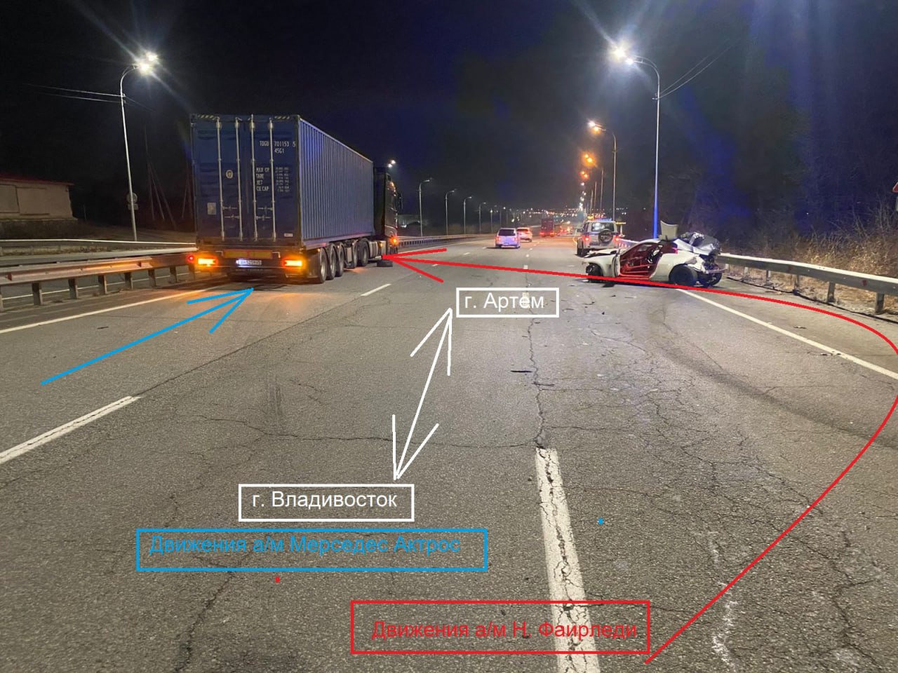 По предварительной информации, 21 ноября в 01.50 в районе дома № 111 на улице Карла Маркса 36-летний водитель транспортного средства Ниссан Файрледи, двигаясь со стороны Владивостока в направлении Артема, не обеспечил постоянный контроль за движением автомобиля, наехал на леерное ограждение после чего совершил столкновение с автомашиной Мерседес Бенц Актрос, которая двигалась в попутном направлении.