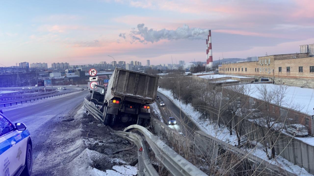 Так, в утренние часы в районе Фадеевской развязки водитель большегруза не справился с управлением транспортного средства и совершил наезд на леерное ограждение.