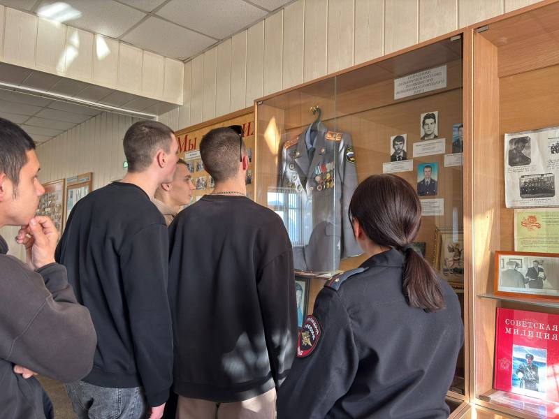 Специалист по воспитательной работе старший лейтенант полиции Альбина Сырникова провела экскурсию по комнате-музею полиции. Здесь студенты увидели форменное обмундирование разных эпох, фотографии и личные вещи сотрудников, а также боевые награды сотрудников органов внутренних дел.