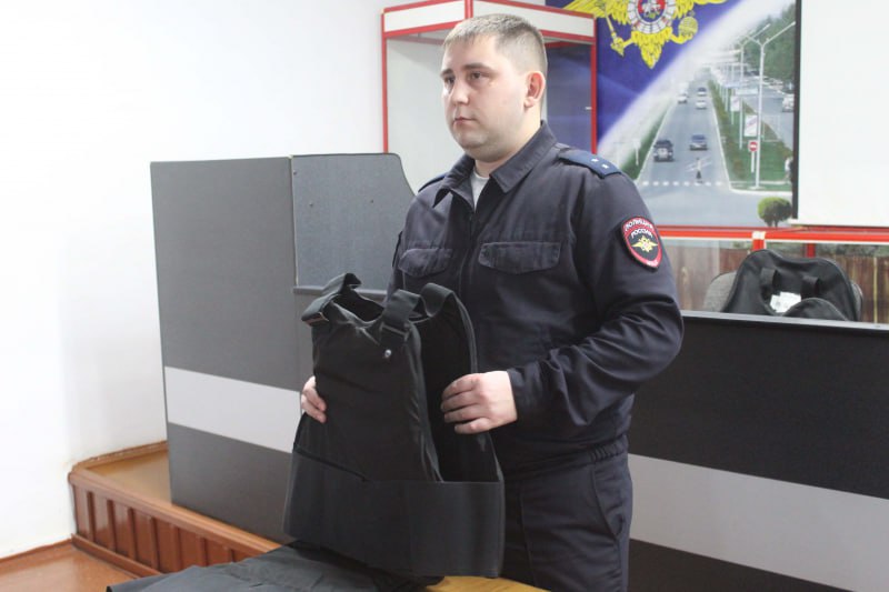 В актовом зале продемонстрировали спецсредства, разборку-сборку пистолета Макарова. Смельчаки примерили бронежилет и шлем.