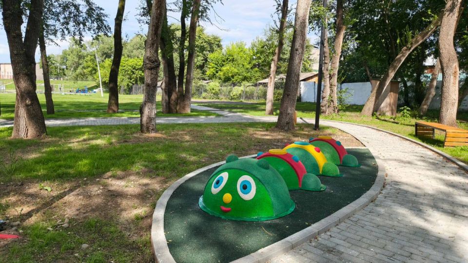 Благоустроены пешеходные дорожки из брусчатки, установлены качели, лавочки, урны, шахматные столы и теннисный стол.В «Зоне отдыха" появился объект в виде милой гусеницы, который станет интересным элементом для детей и внесет яркие акценты в ландшафт...