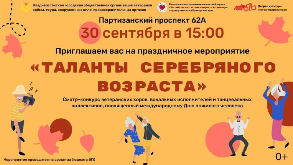 Мероприятие состоится во вторник, 30 сентября, в большом зале Дворца культуры железнодорожников (Партизанский проспект, 62а). Начало в 15:00.В нем примут участие 15 творческих коллективов. Все желающие смогут насладиться песнями, музыкой и праздником...