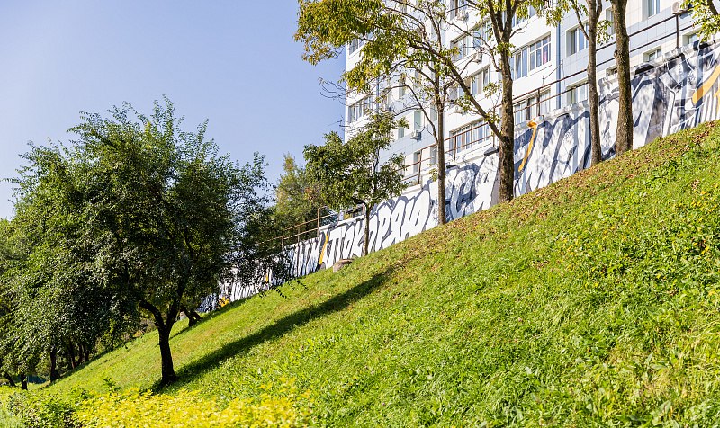 Подпорная стена на проспекте 100-летия Владивостока, 145а превратилась в масштабное художественное полотно, рассказывающее о морской душе города. Автором эскиза стал художник Макс Майз.