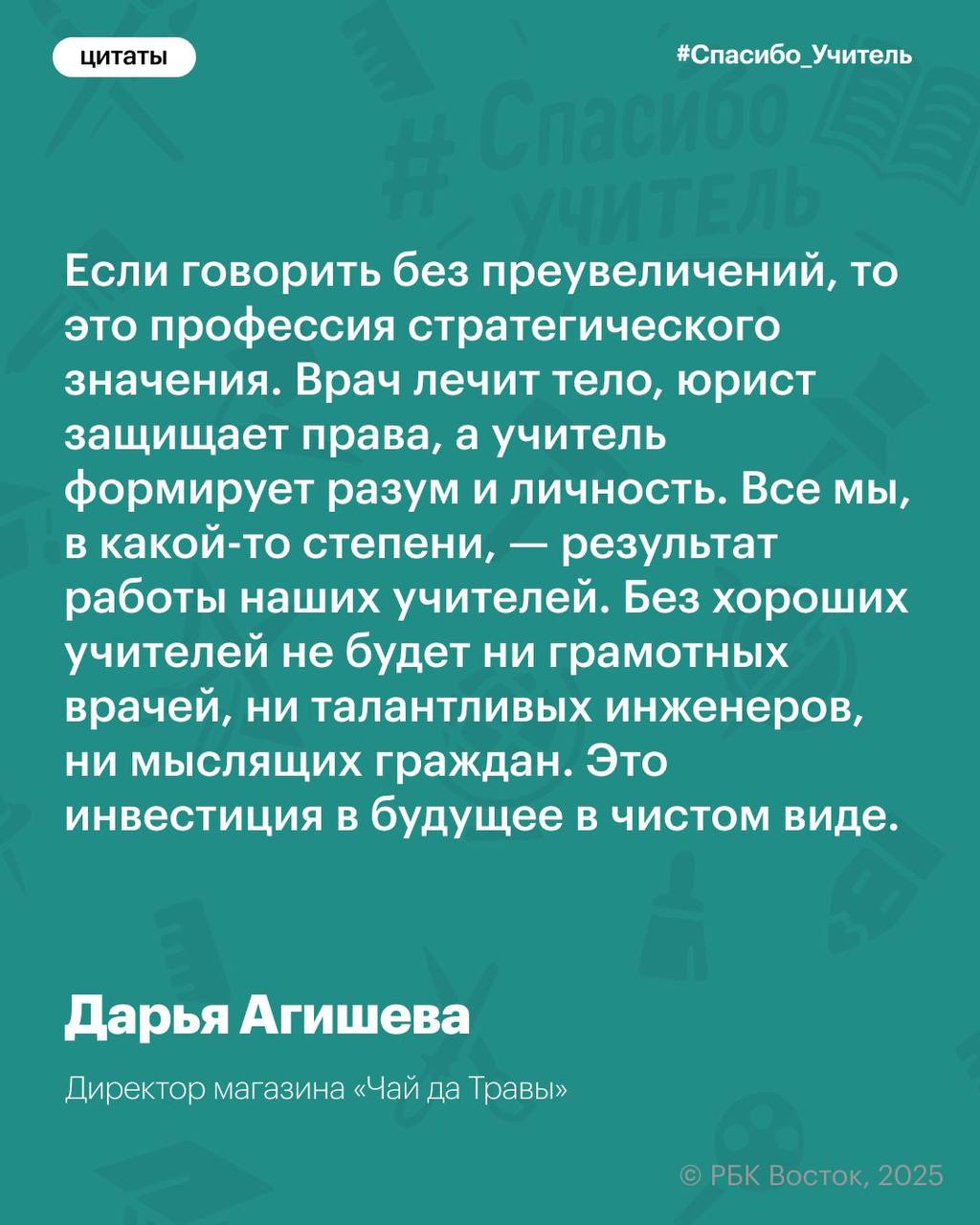 Так, директор магазина «Чай да травы» Дарья Агишева рассказала РБК Восток, что компания предоставляет учителям недельную скидку на авторские купажи, травы и ягоды, сладости, посуду и многое другое. Она также отметила, что без хороших учителей никогда не будет ни грамотных врачей, ни талантливых инженеров. Все мы, в какой-то степени, — результаты работы школьных педагогов, добавила Агишева.