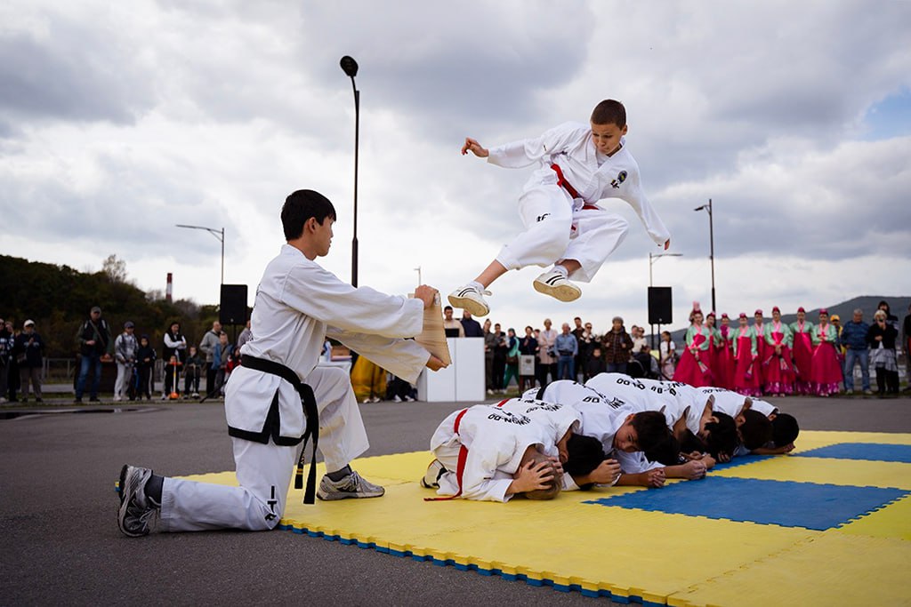 Энергичные показательные выступления по тхэквондо и национальной борьбе ссирым