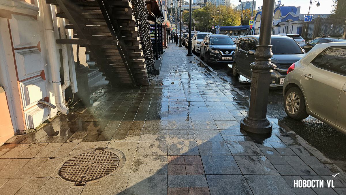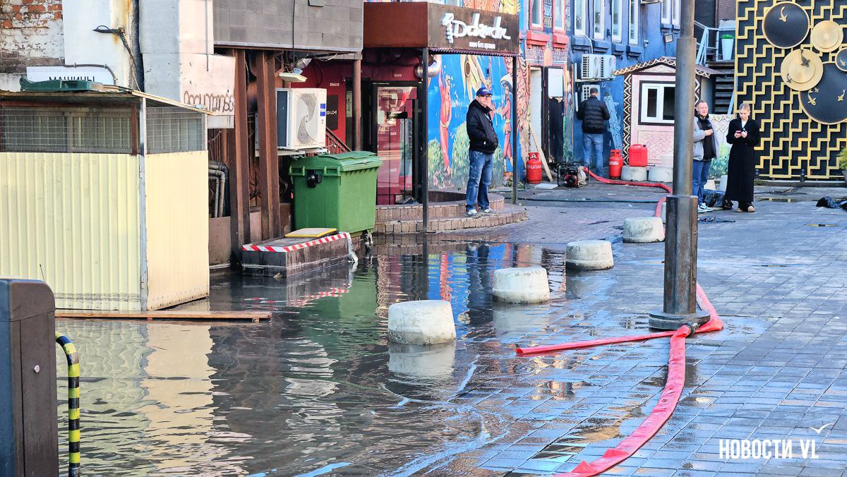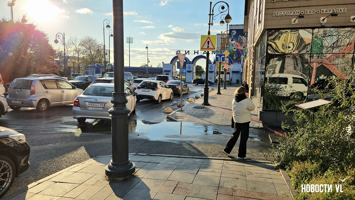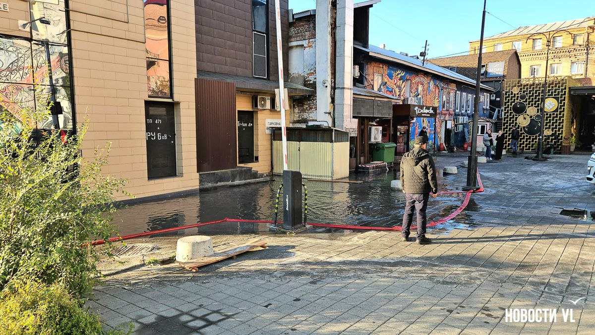 На перекрёстке Пограничной и Семёновской во Владивостоке прорвало трубы. Горячая вода заливает парковку ресторанов Миллионки и сами заведения на обеих улицах. В глубокую лужу кинули шланг и пытаются слить образовавшееся «море» на дорогу.