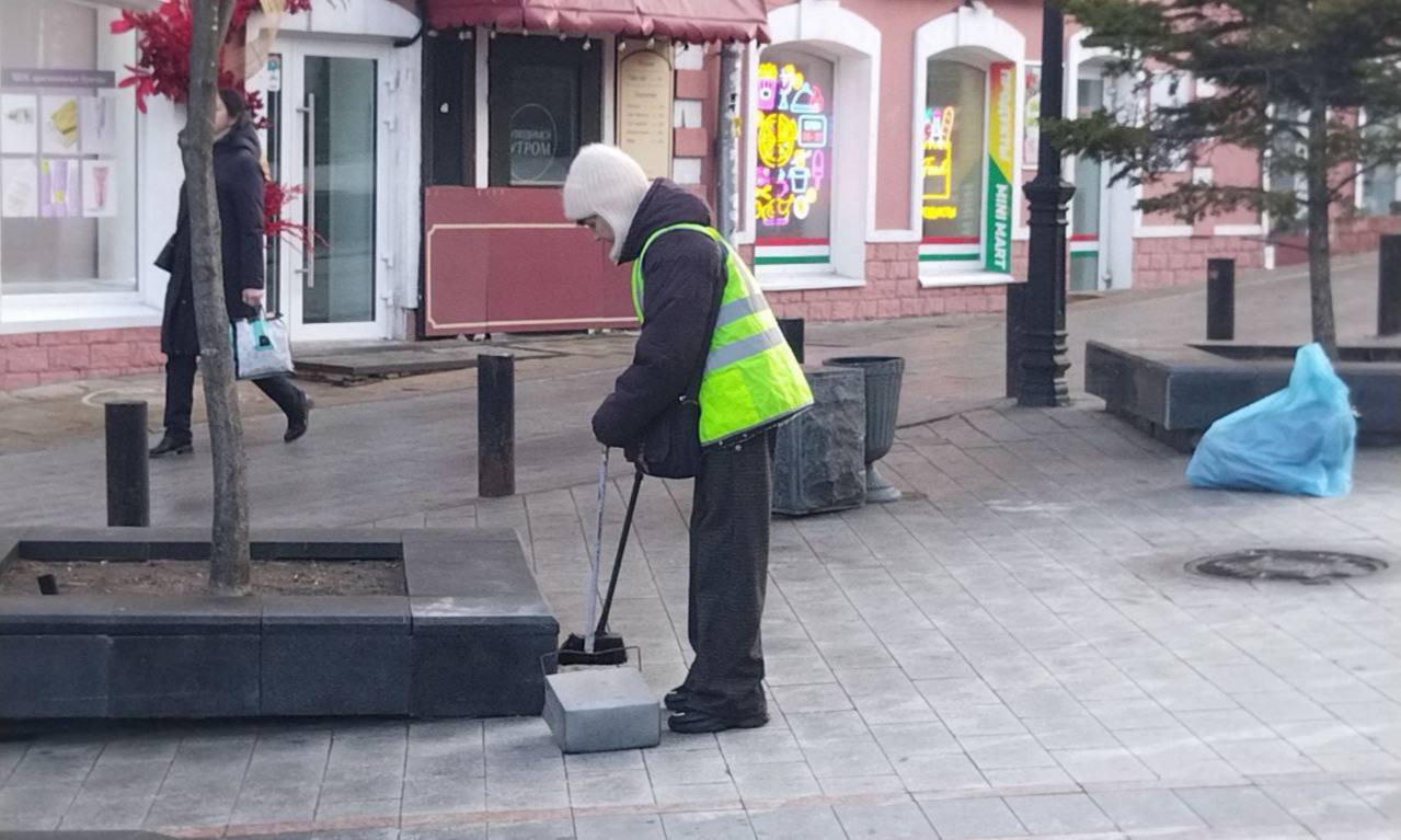 Специализированная бригада выполняет ручную уборку тротуаров и прибордюрной полосы на улице Светланской (от площади Луговой до остановки «Гайдамак»).