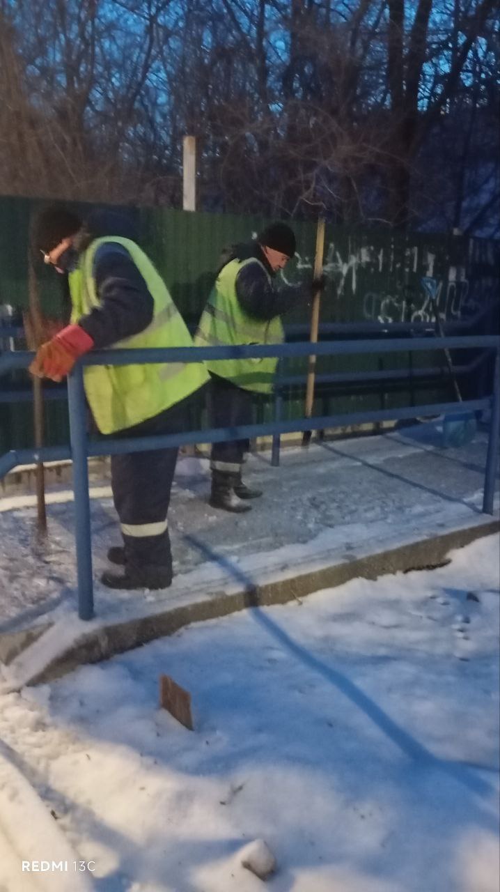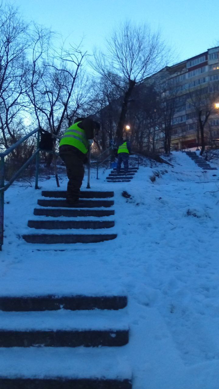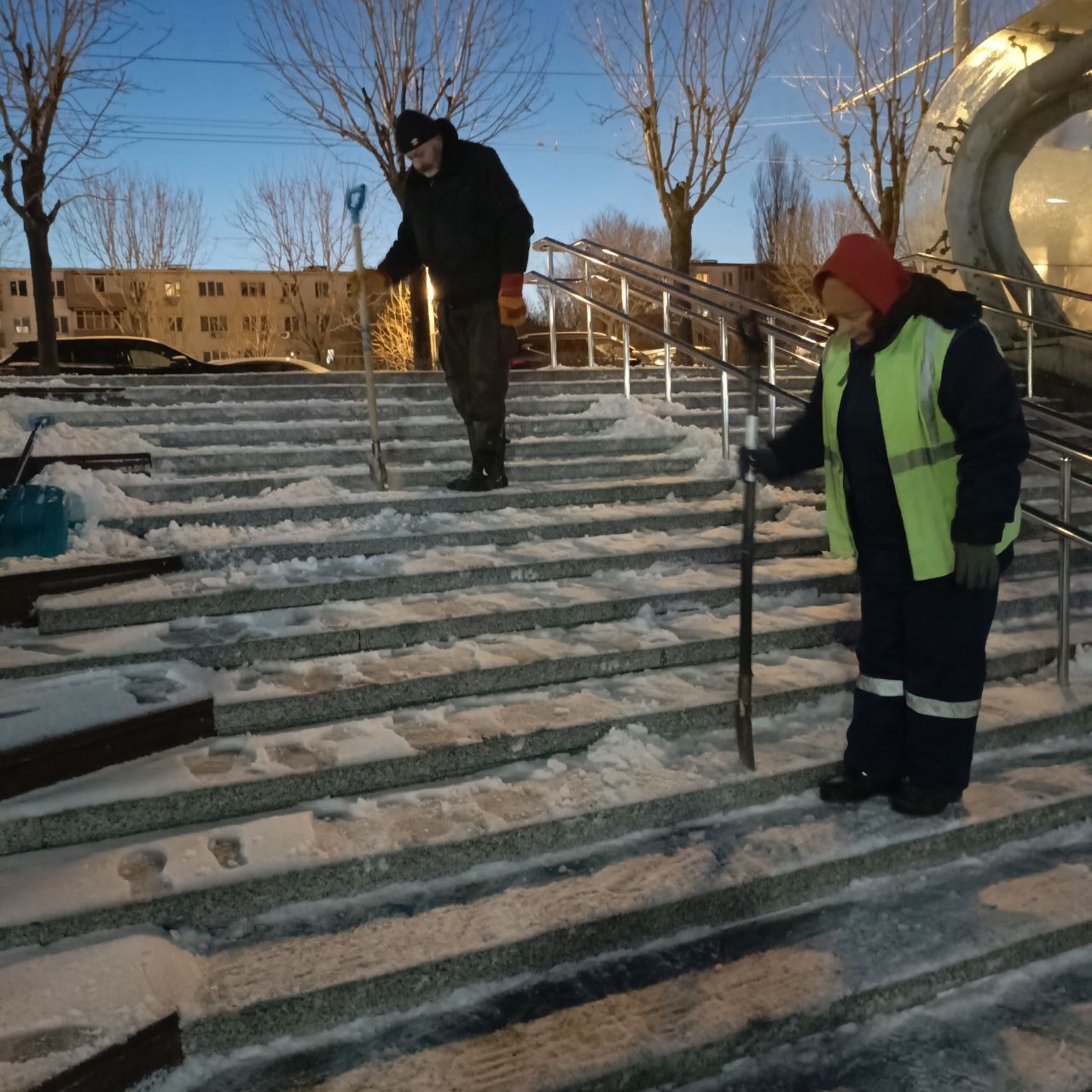 Рабочие активно работают во всех районах города: убирают снег, наледь и обрабатывают лестницы противогололедными материалами.
