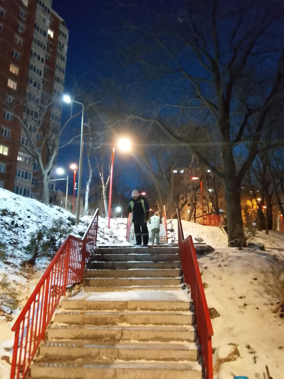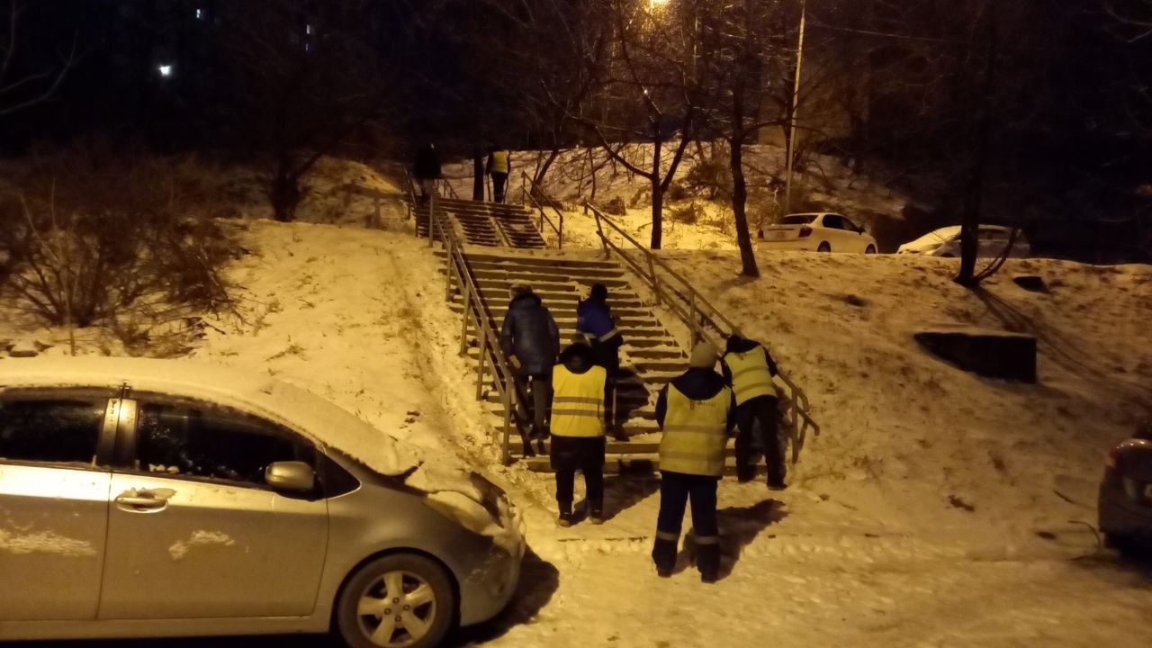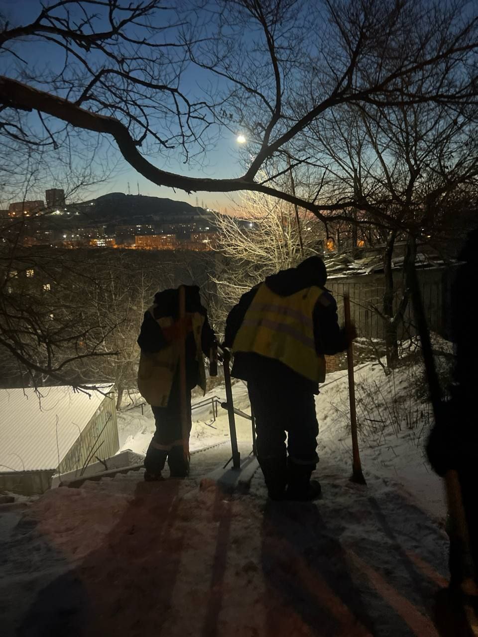 Рабочие активно работают во всех районах города: убирают снег, наледь и обрабатывают лестницы противогололедными материалами.