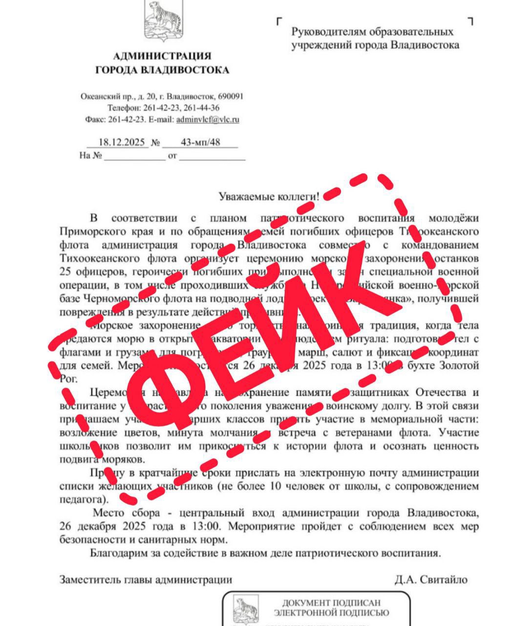Внимание ФЕЙК. Распространяемое в мессенджерах и через электронную почту сообщение о церемонии морского захоронения останков офицеров Тихоокеанского флота в бухте Золотой Рог – не соответствует действительности