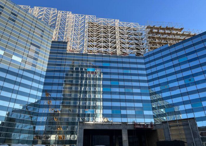 Завершены кровельные работы, установлена часть стеклянного фасада.