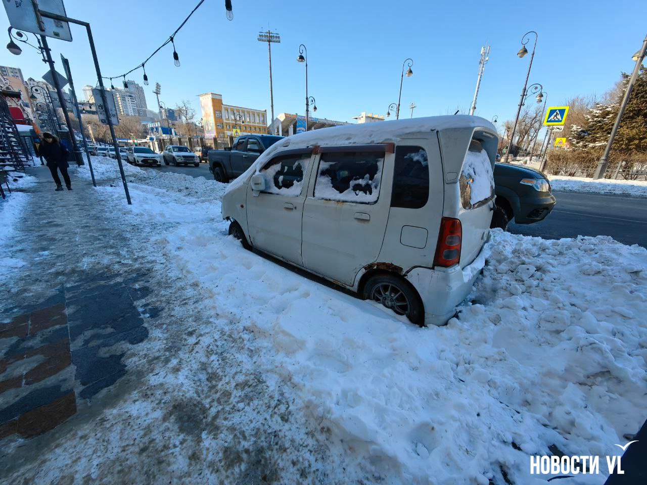 Большое количество автомобилей мешает убирать снег во Владивостоке