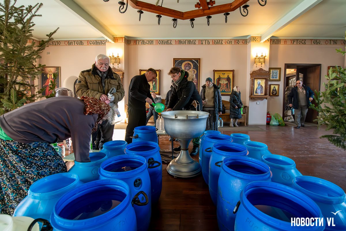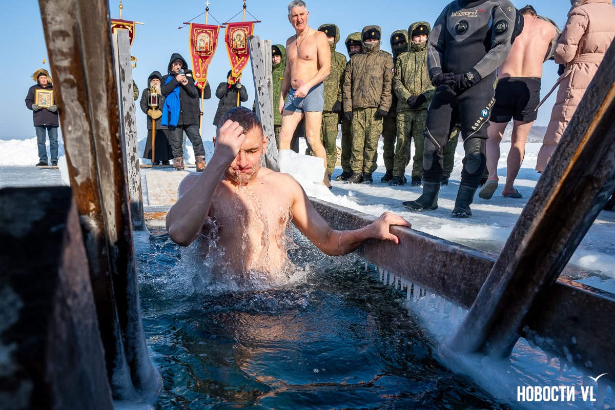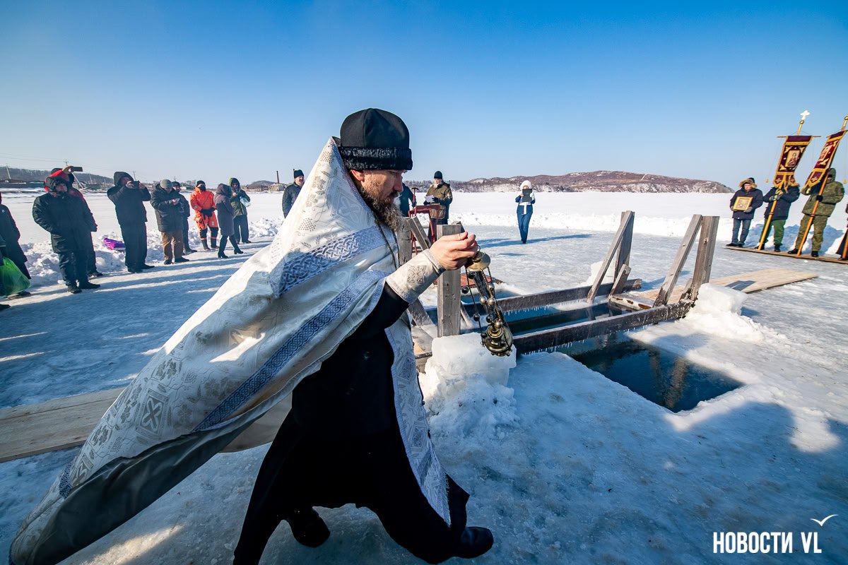 Днём в понедельник, 19 января, у Свято-Серафимовского мужского монастыря на Русском острове состоялись крестный ход и крещенские купания. Окунуться в ледяную воду желающих было не очень много – около 50 человек. По сравнению с прошлым годом погода не благоволила, сегодня на улице - 15 °С, зато на острове обошлось без сильного ветра, который дул в городе.