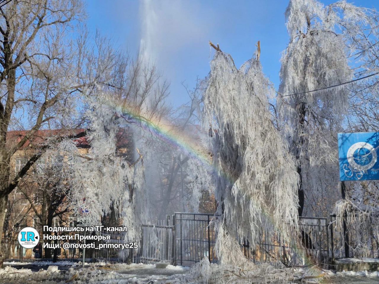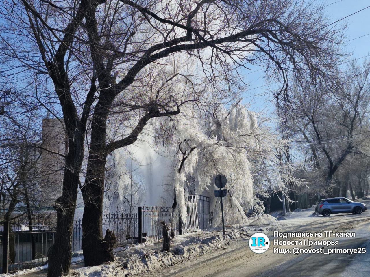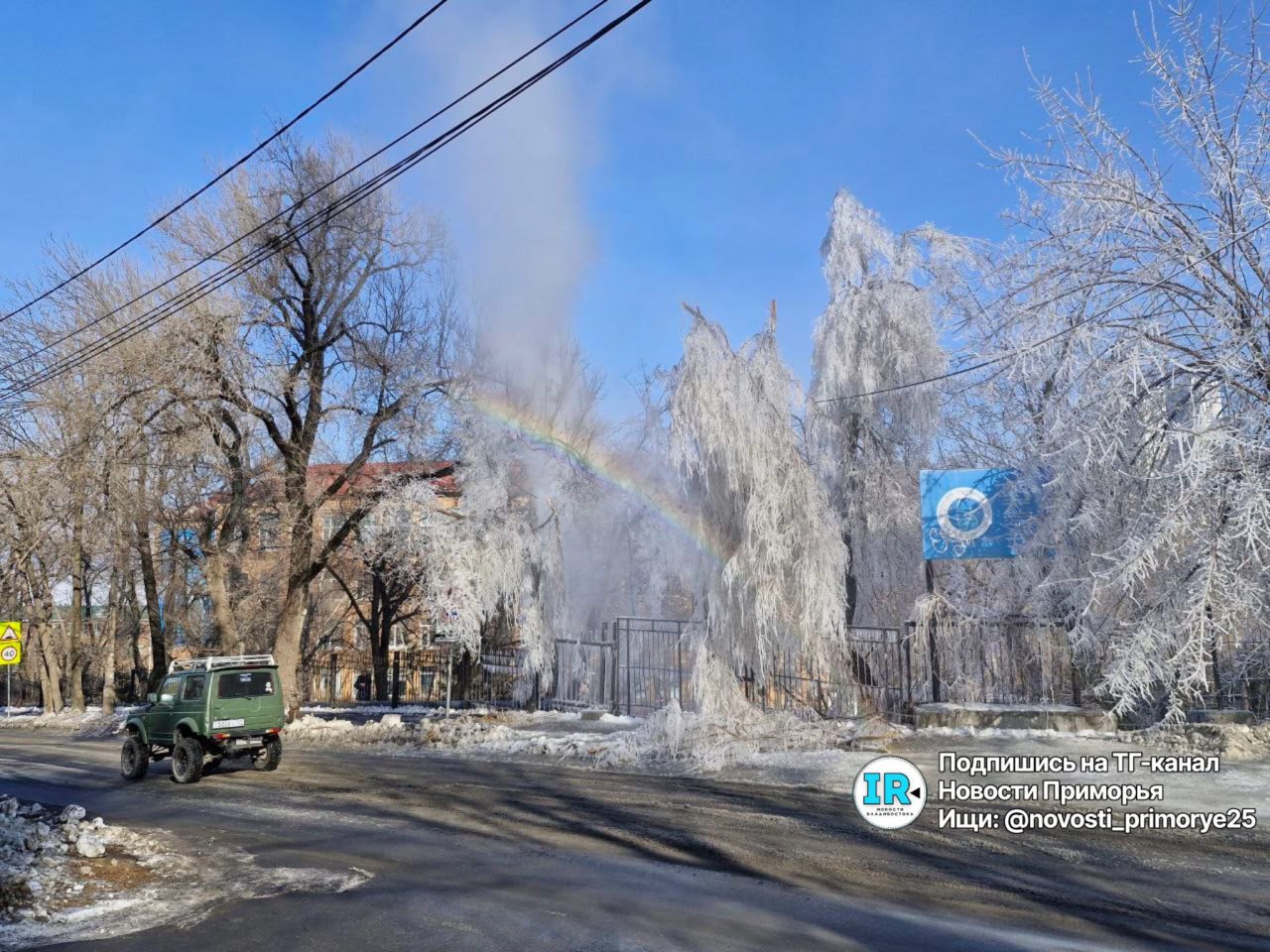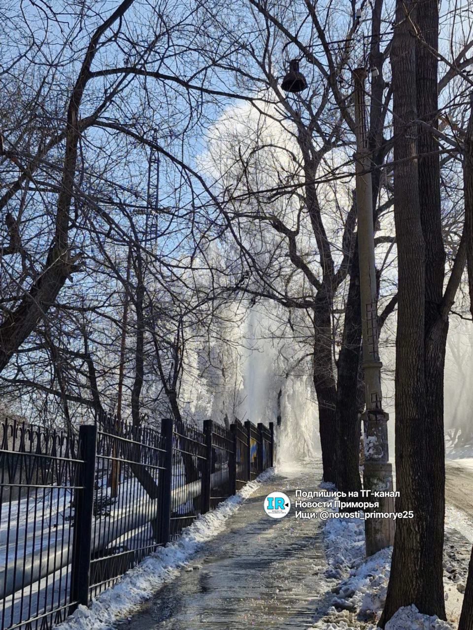 Порыв произошёл на участке улицы Чапаева между поворотами к Байдукова и Каспийской. Труба теплотрассы здесь идёт вдоль забора школы, она проложена не в земле, а наружным способом. По состоянию на 15:00 аварийной бригады на месте ещё не было. Столб...
