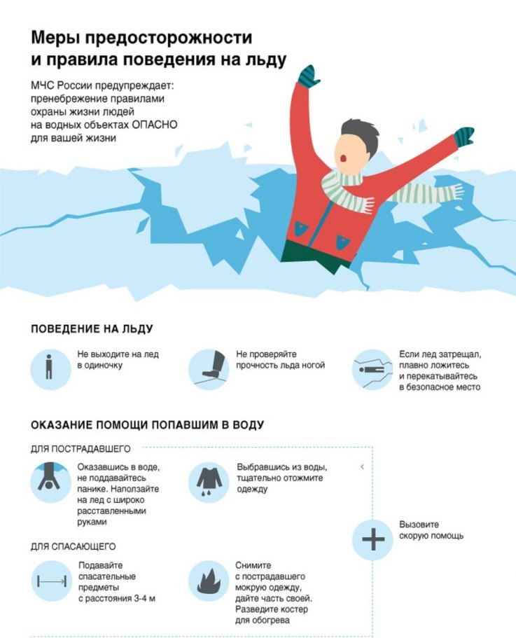 не приближайтесь к промоинам, трещинам, прорубям на льду