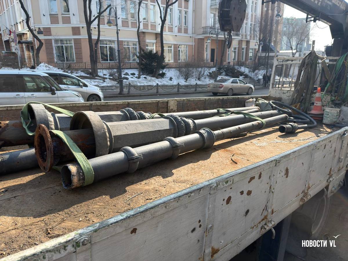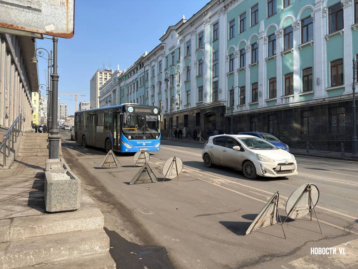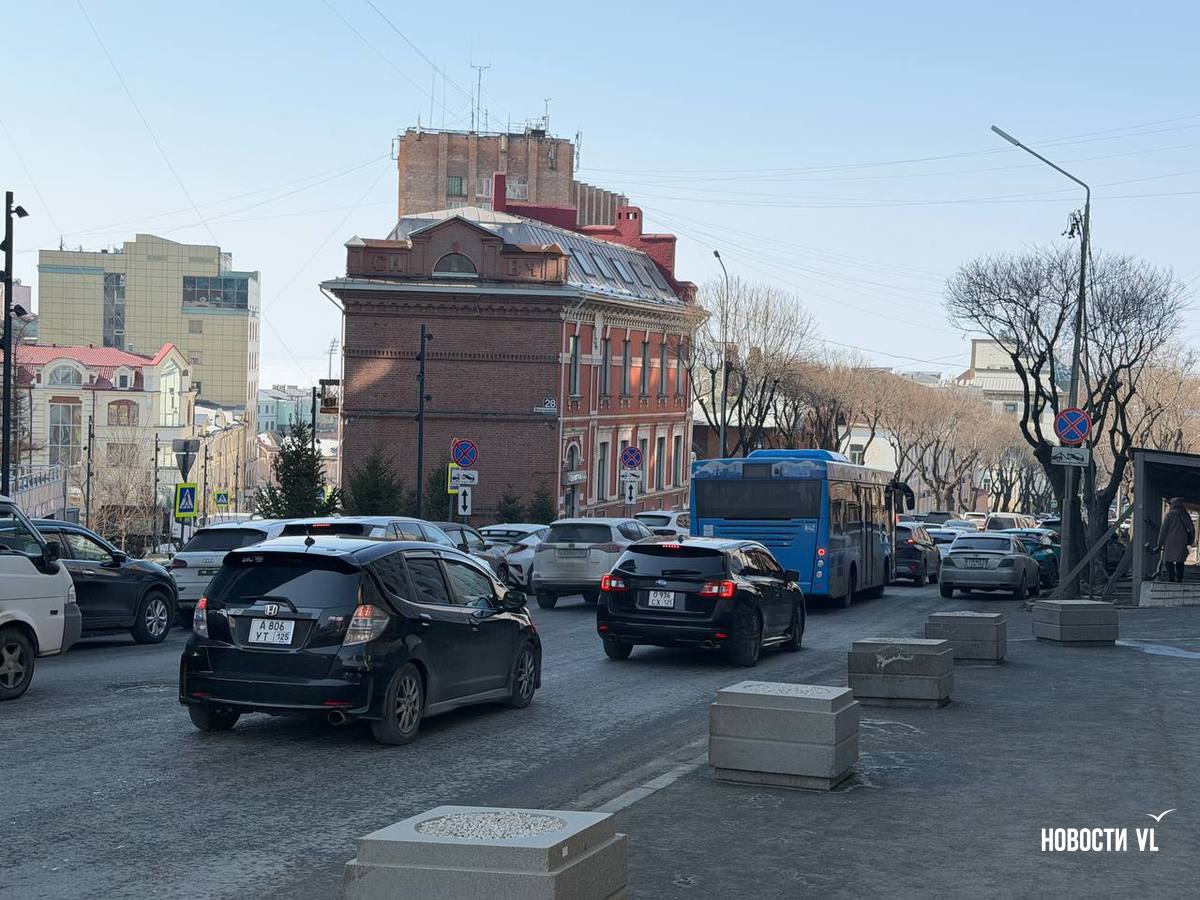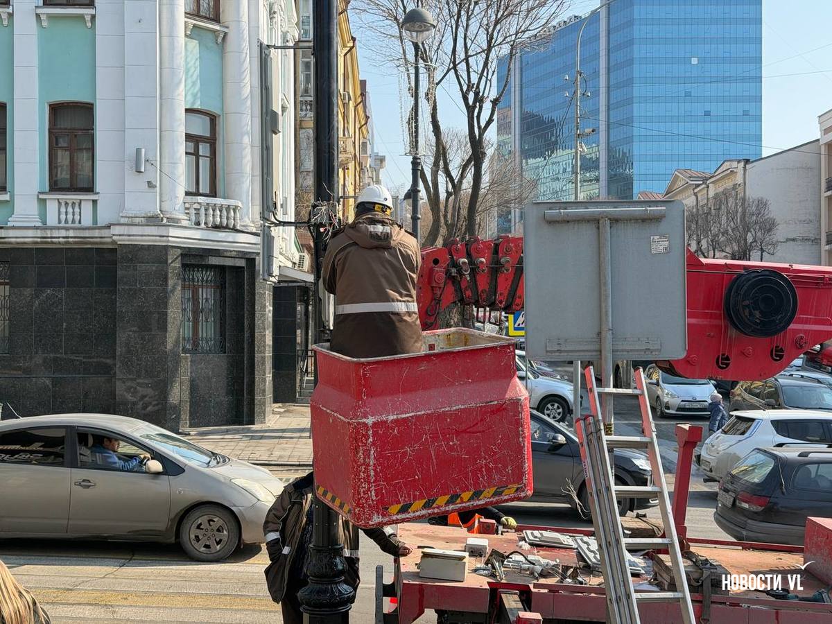 В пятницу, 13 февраля, в центре Владивостока меняют столбы освещения и перевешивают светофоры. Работы ведут с правой стороны на перекрёстке Алеутской и Фонтанной. Из-за того, что часть автобусной полосы заняты автовышкой и дорожными знаками, собирается пробка.