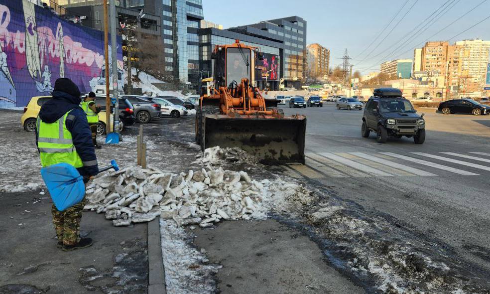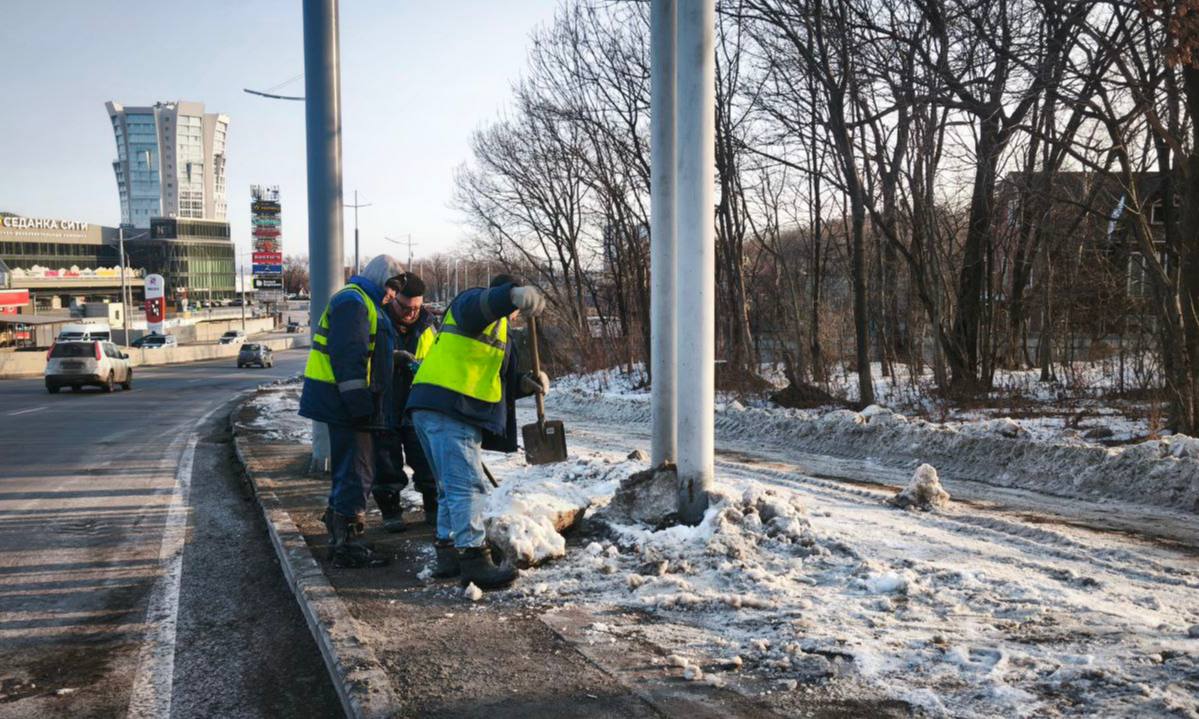 Первореченский район — ручная уборка тротуара на улице Сабанеева; комплексная уборка и вывоз снега на Баляева.