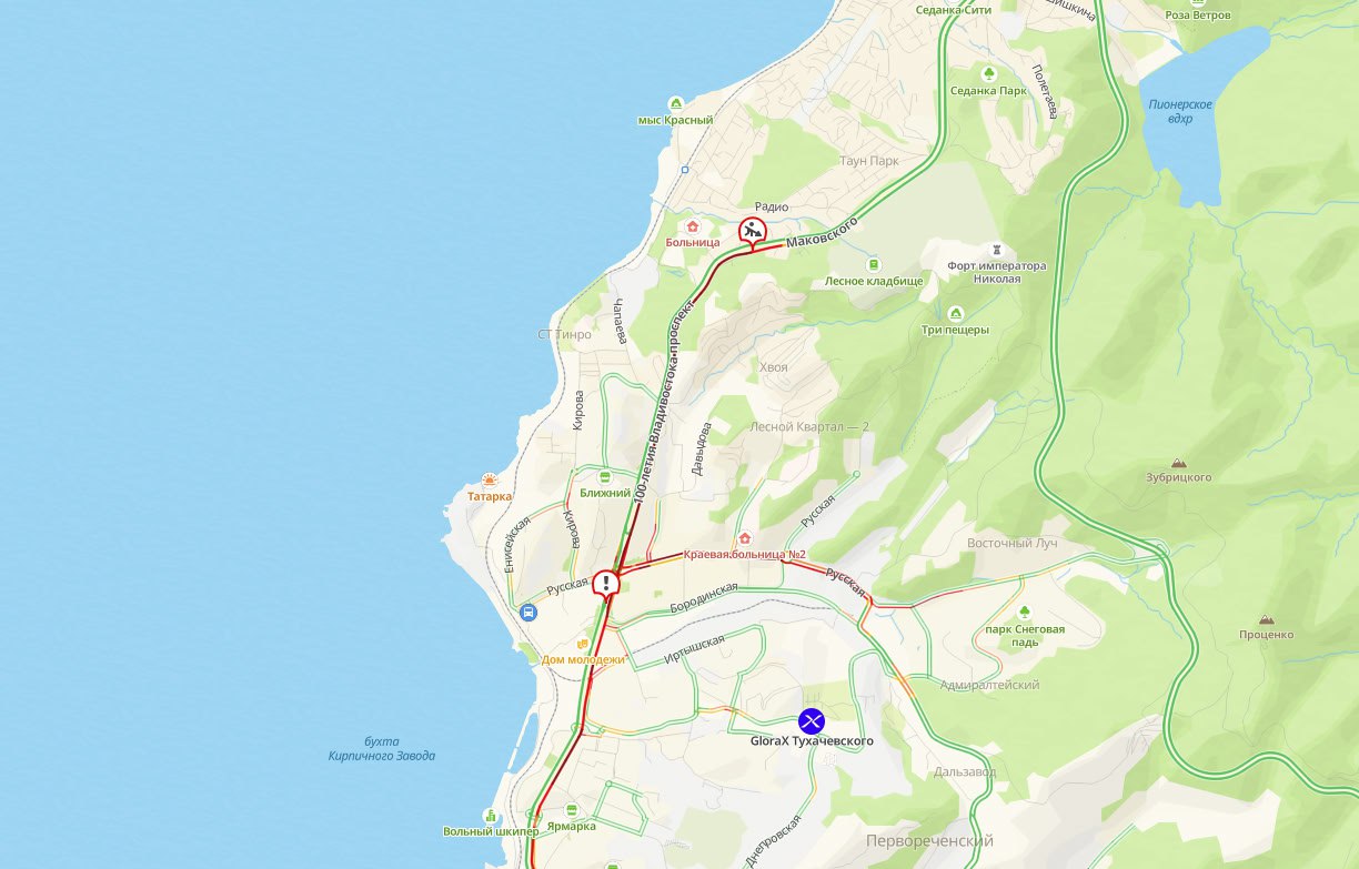 На Маковского в районе Лесного кладбища убирают снег с обочины. «Хвост» пробки растянулся до самого Некрасовского путепровода.