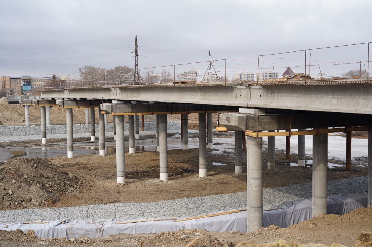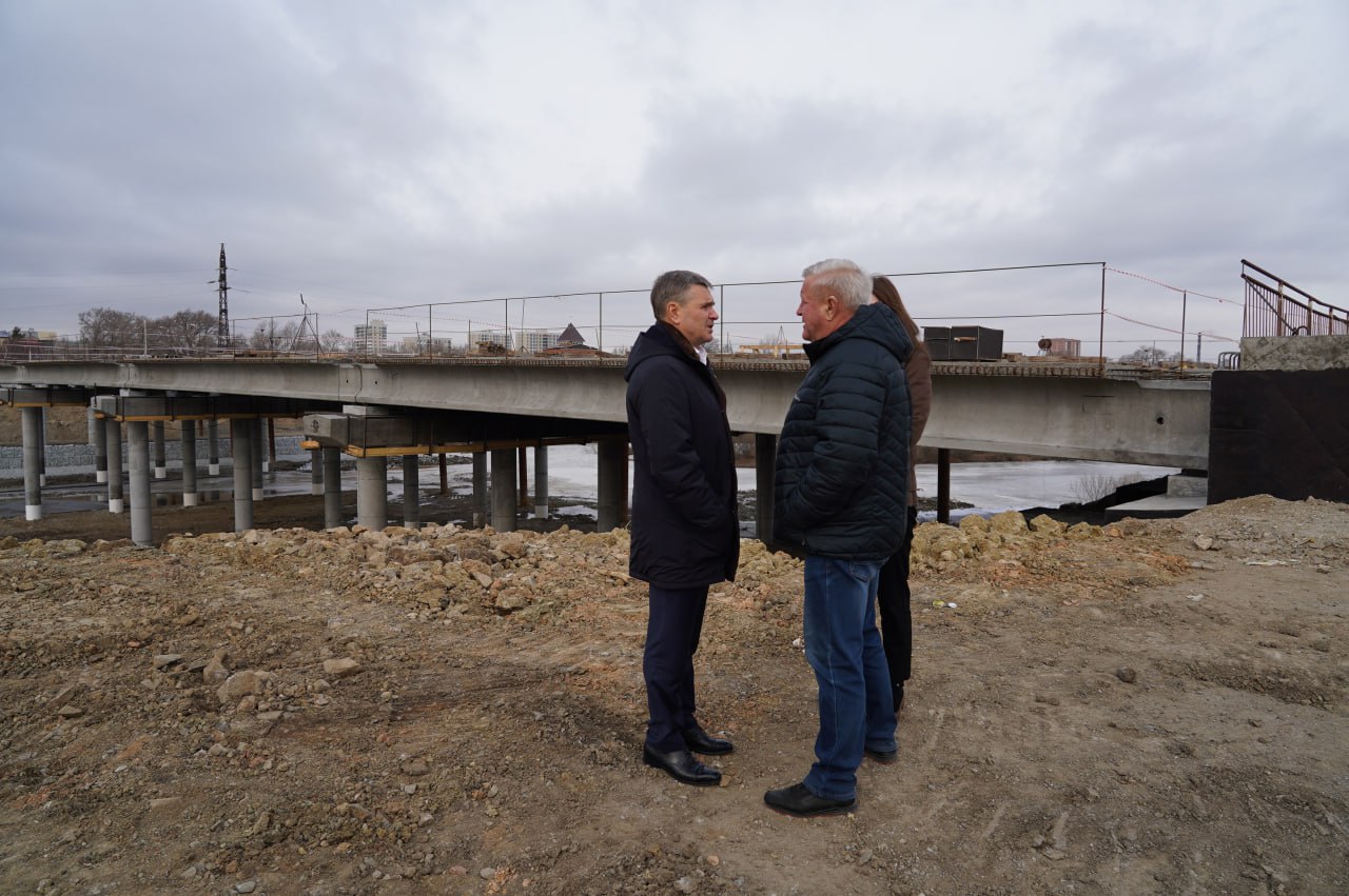 Также проконтролировал строительство моста по ул. Чичерина. Опоры почти завершены: осталось уложить еще один пролет балок. Сейчас строители устраивают габионы - это подготовка к паводковому периоду по укреплению русла реки.