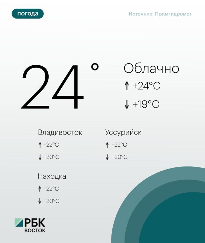 Без осадков. Ветер южный умеренный. Температура воздуха днём +19...+24°СВо Владивостоке переменная облачность, без осадков. Ветер южный умеренный. Температура воздуха +20...+22°C.Подписывайтесь на РБК...