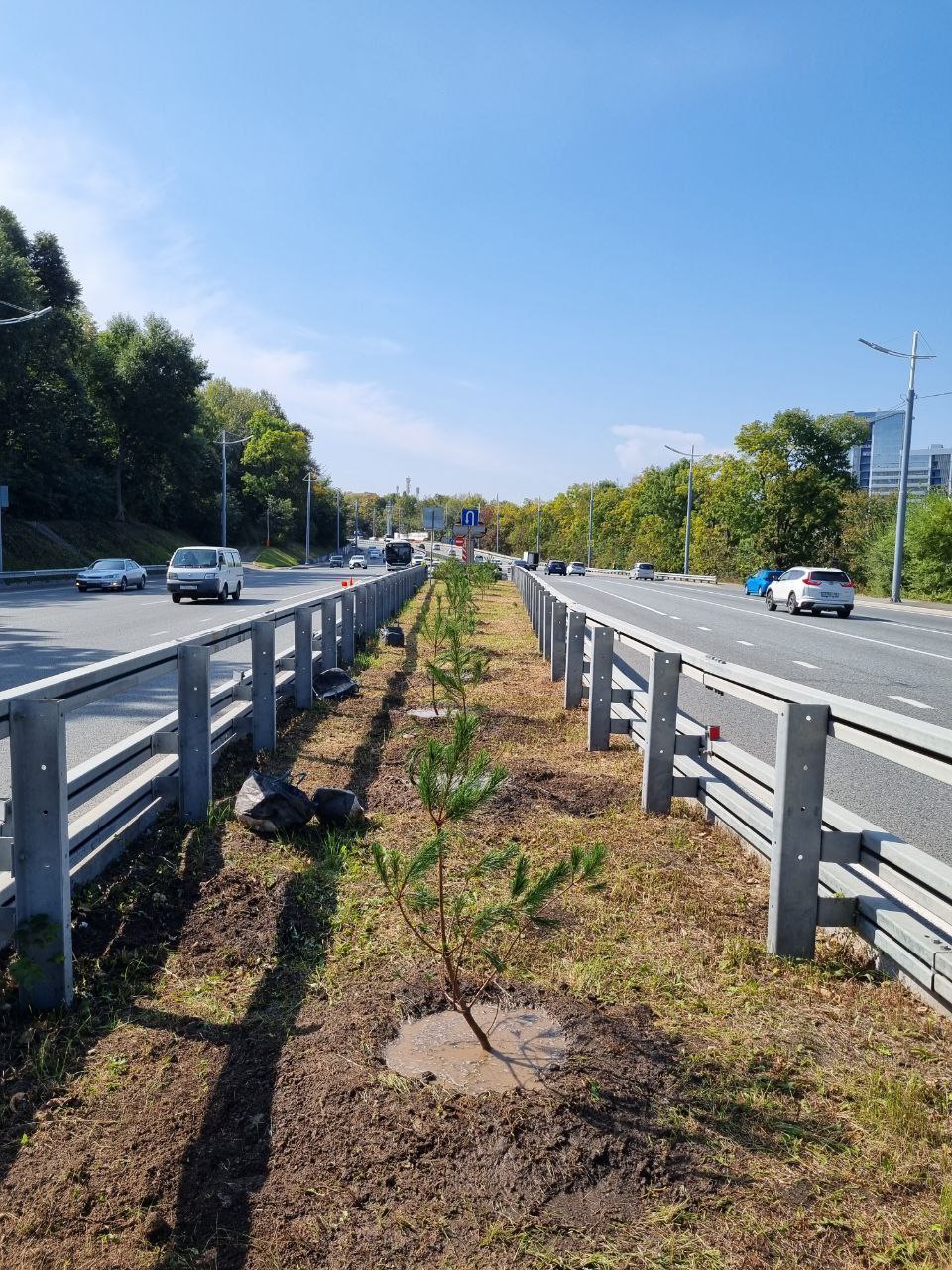 По улице Маковского работники высадили сосну могильную на разделительной полосе. Напомним, первые сосны появились здесь в 2022 году.
