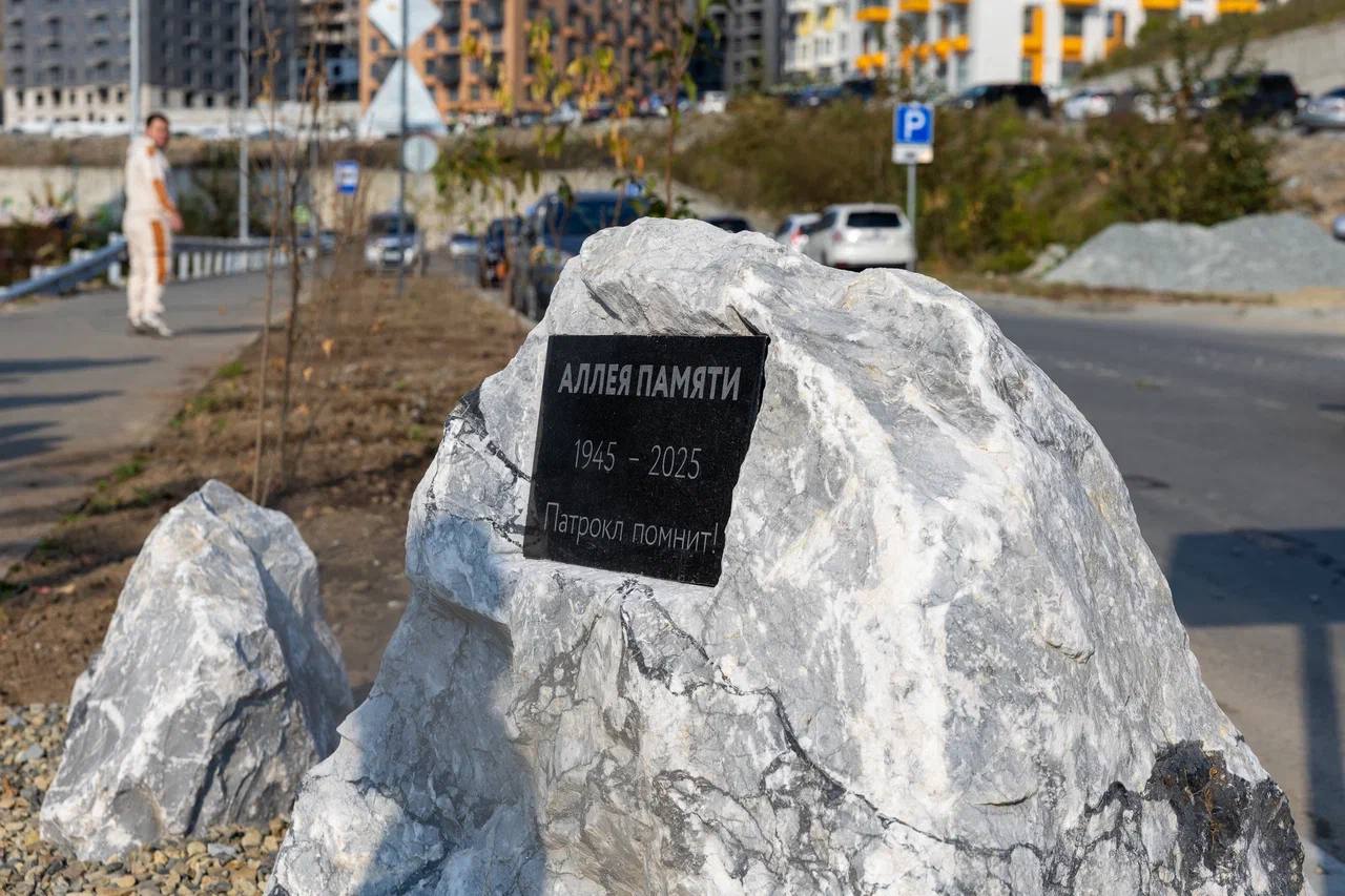 Активное преображение территории началось 20 сентября с масштабного субботника, в котором приняли участие более 70 человек. В тот день была заложена сама аллея, символически состоящая из 80 деревьев в честь 80-летия Великой Победы. Были высажены бересклет Маака и сирень амурская. Также вдоль дома по Сочинской, 7 появились 30 саженцев груши уссурийской. Тогда же был установлен и мемориальный камень, а 22 сентября на нем закрепили памятную табличку с надписью: «Аллея Памяти. 1945-2025. Патрокл помнит!».