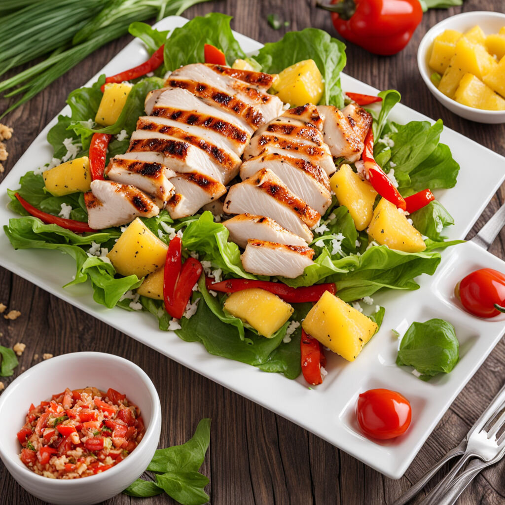 Обжарьте куриное филе на гриле до золотистой корочки. Нарежьте ананас и перец кубиками, после чего смешайте их с курицей и салатными листьями в большой миске. Заправьте оливковым маслом, добавьте соль и перец по вкусу. Посыпьте кунжутом перед подачей. В качестве альтернативы можно использовать консервированный ананас или заменить курицу креветками.