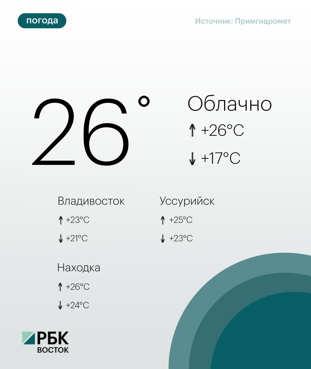 Во Владивостоке переменная облачность, вечером небольшой дождь, днём без осадков. Ветер северный, во второй половине южный умеренный. Температура воздуха +21...+23°C.