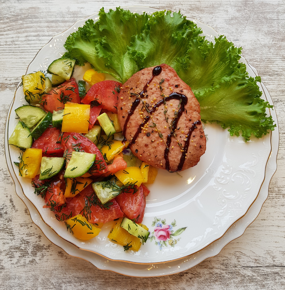 Пока стейки запекаются, займитесь салатом. Удалите сердцевину сладкого перца, нарежьте его кубиками, а огурец – кружочками. Помидоры разрежьте пополам и затем на дольки. Соедините все овощи в одной посуде, добавьте мелко нарезанный укроп, посолите и поперчите. Заправьте салат горчичным маслом и тщательно перемешайте.