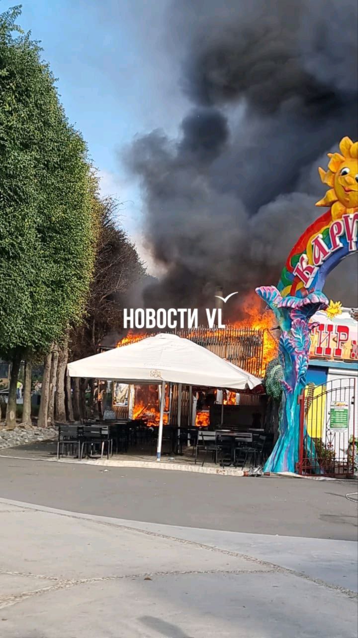 Возле парка аттракционов горит кафе.