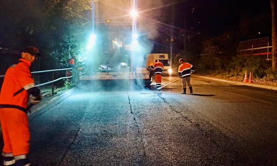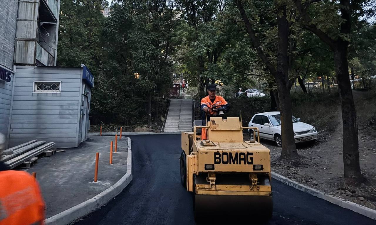 Специалисты сняли поврежденный асфальт и бордюры, после чего уплотнили дорожное основание скальным грунтом и щебеночно-песчаной смесью, установили новые бортовые камни, заменили разрушенную лестницу и уложили новое асфальтобетонное покрытие в два слоя. Работы выполнили за неделю.