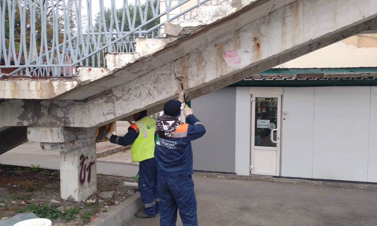 Специализированная бригада окрашивает ограждения надземных пешеходных переходов в районе Баляевской развязки.