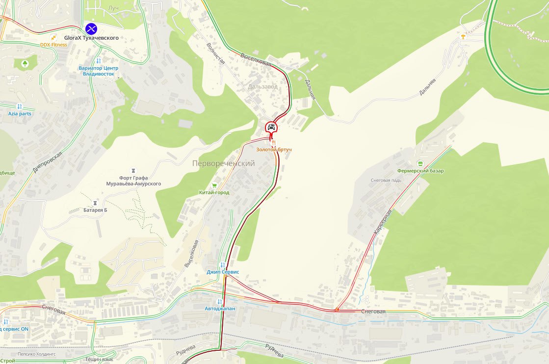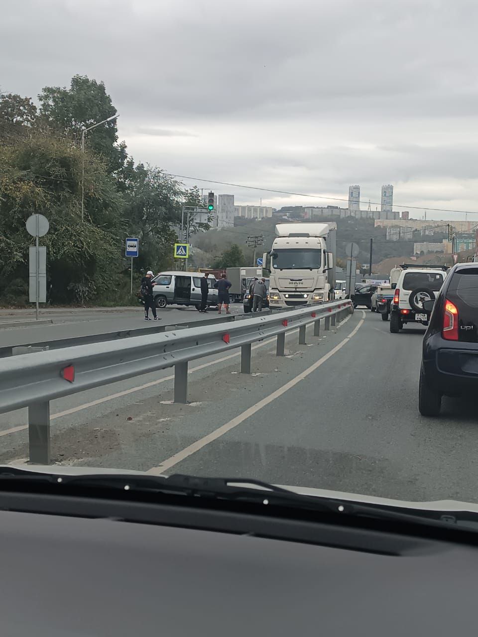 На Выселковой произошёл транспортный коллапс из-за ДТП на светофоре в районе поворота к Китай-городу. Большегрузы с трудом протискиваются между Suzuki Escudo и леерами.