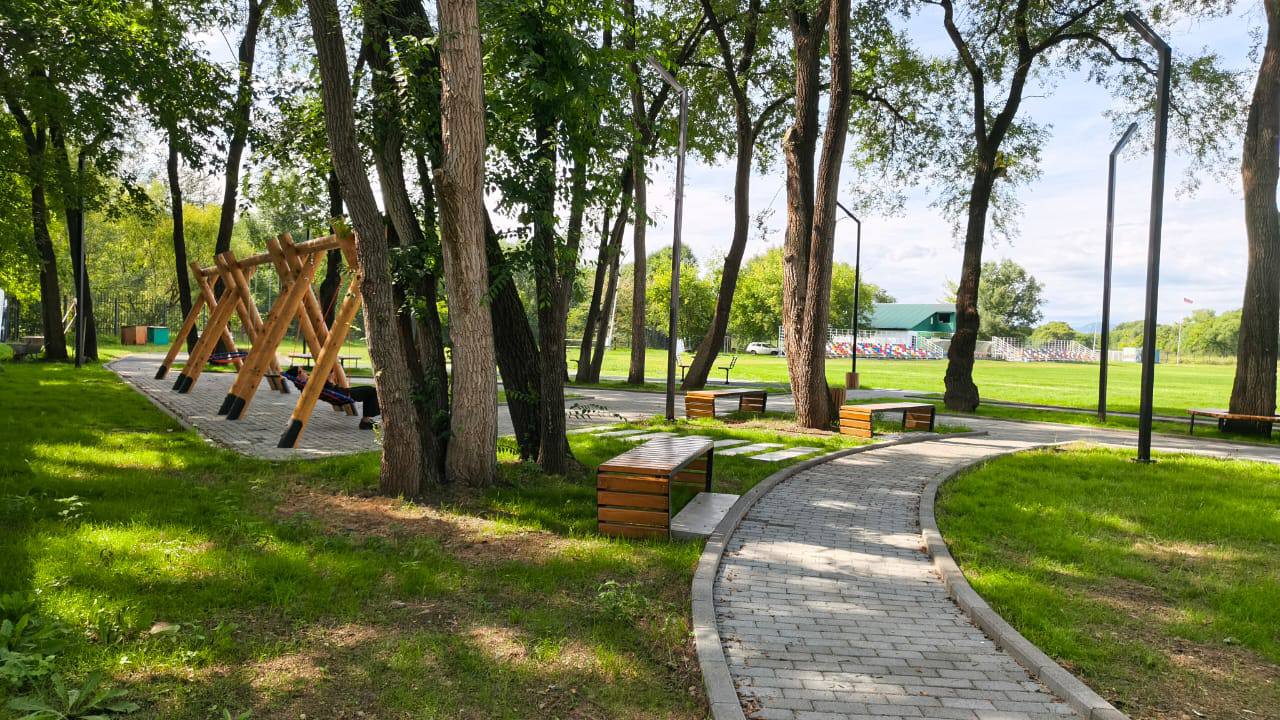 Благоустроены пешеходные дорожки из брусчатки, установлены качели, лавочки, урны, шахматные столы и теннисный стол.