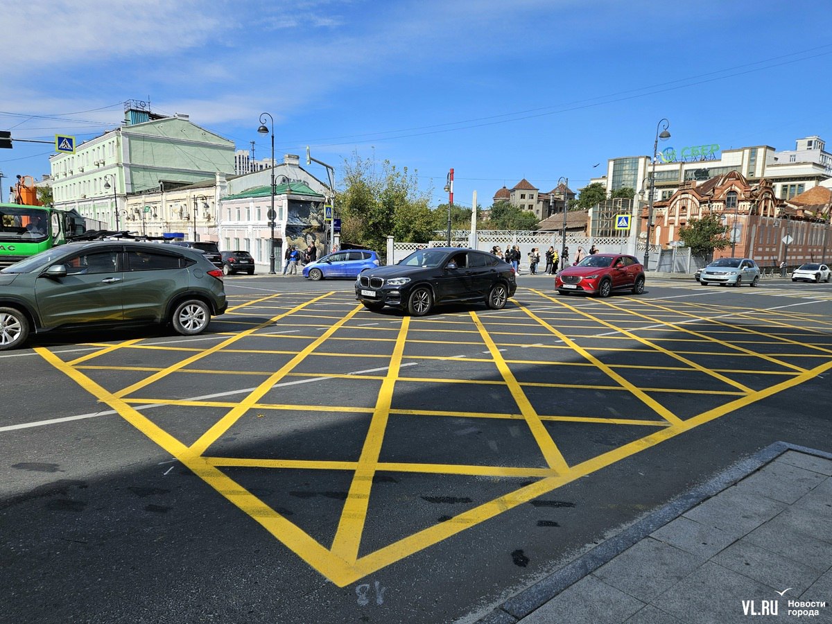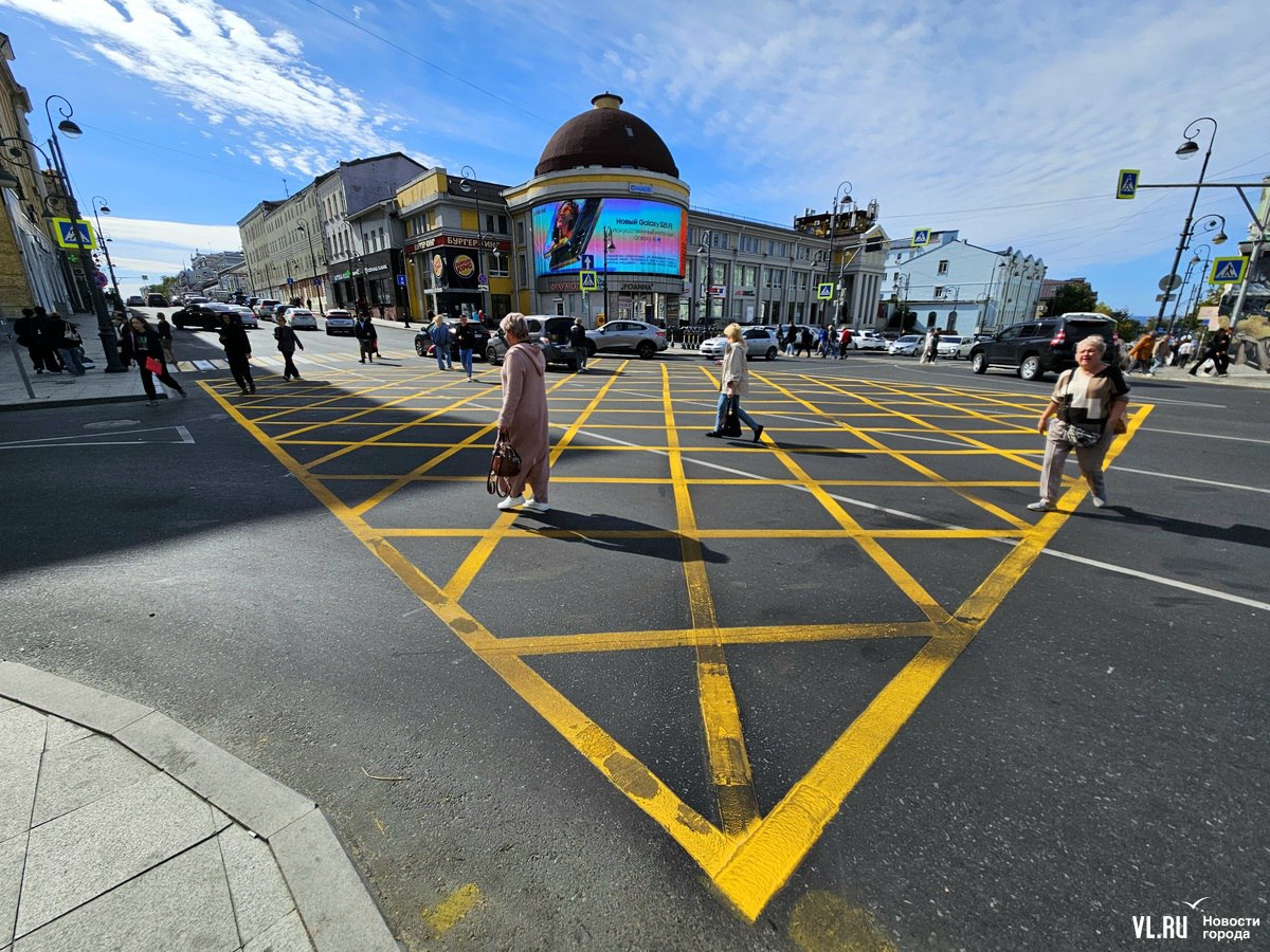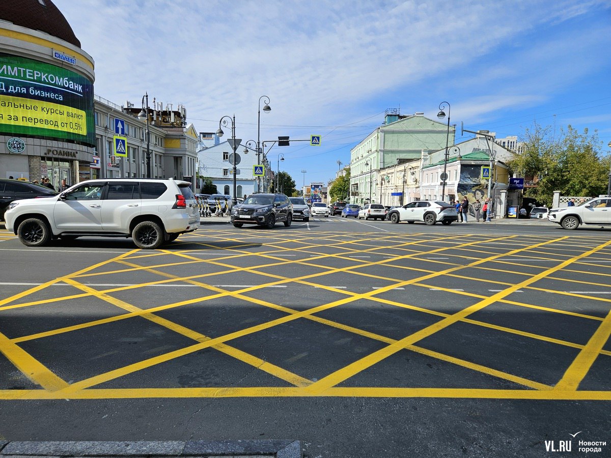 Во Владивостоке впервые нанесли разметку-вафельницу у площади Семёновской и обновили ещё на трёх перекрёстках