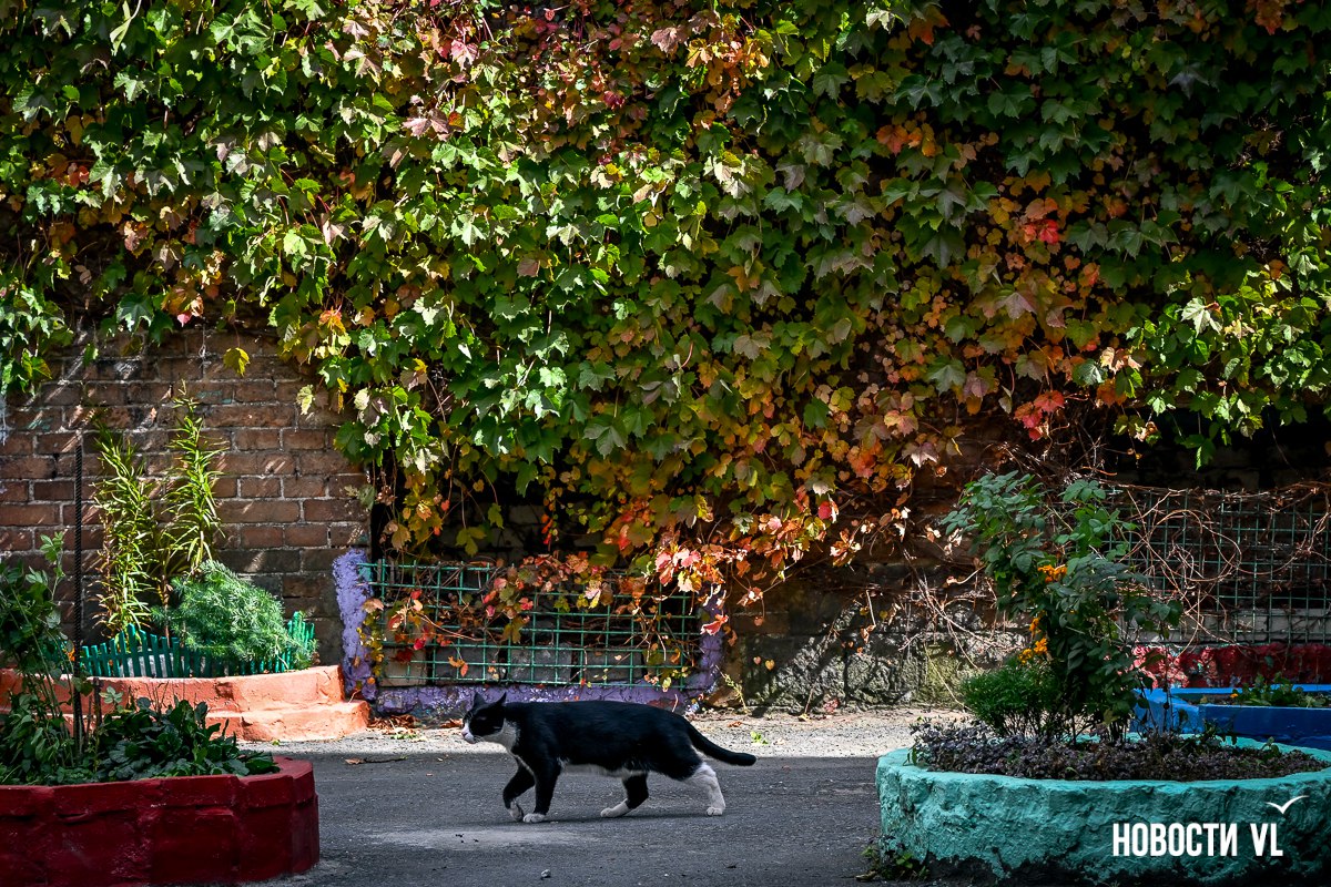 Осенний листопад во Владивостоке переживают не только деревья и кустарники, но и лианы. В городе их немного, но всё-таки есть. По декоративности покрывающиеся багрянцем лианы могут поспорить с воспетыми кострами рябин. Часть растений пока и не думает сбрасывать листья: остаётся активно-зелёной и едва начинает менять цвет. Но и она скоро покраснеет или пожелтеет. Горожане называют их плющом, но это два вида девичьего винограда. Настоящие плющи в нашем климате зимовать не могут.