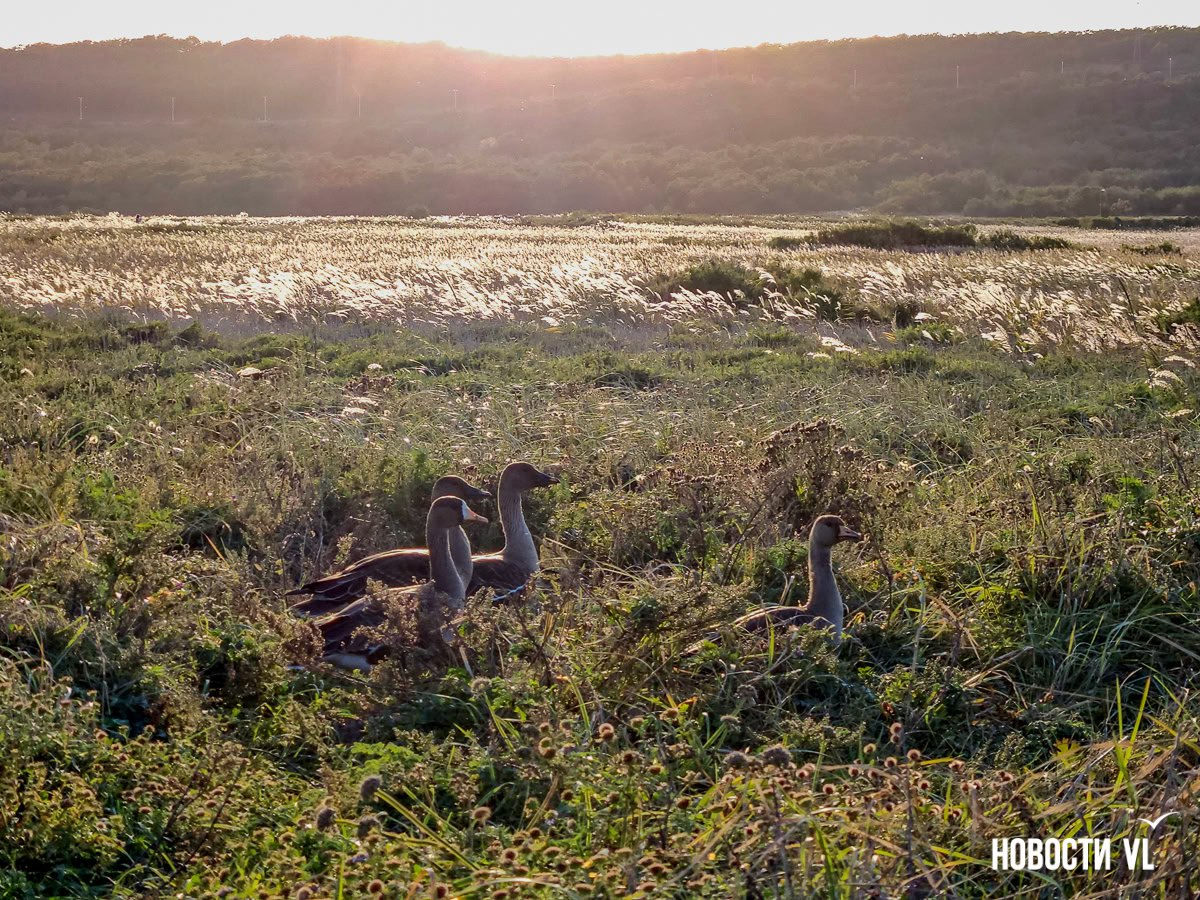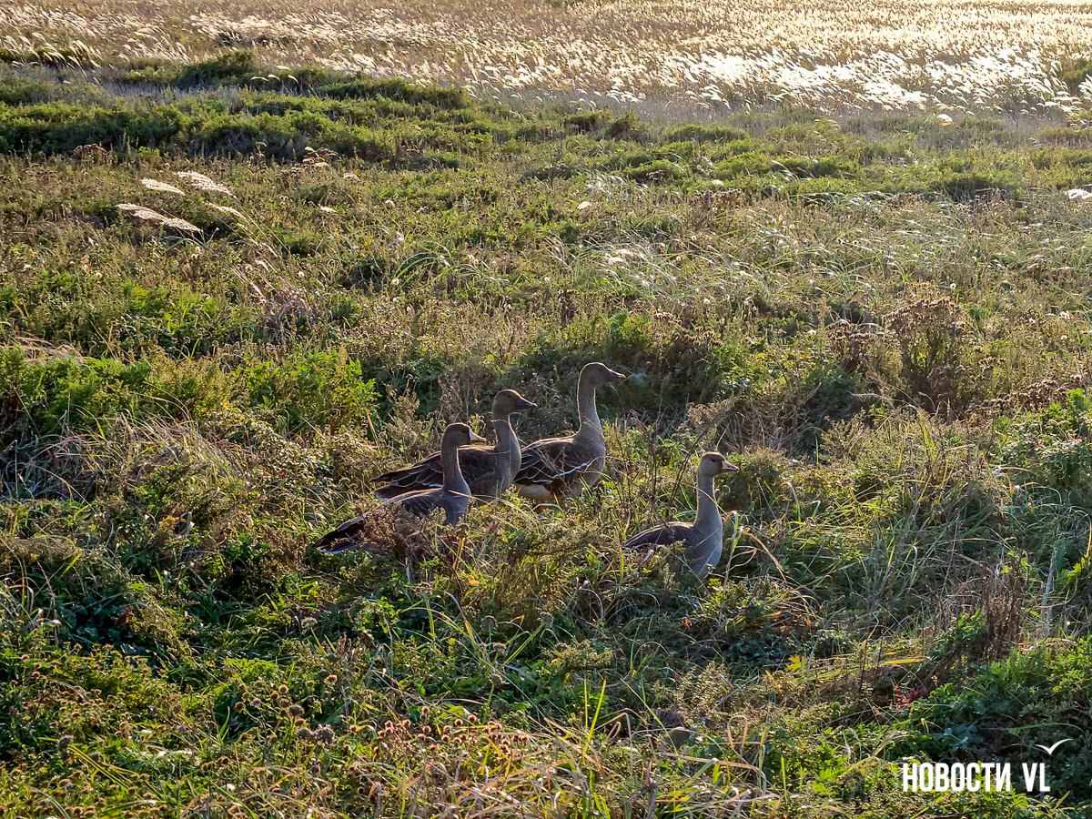 На мысе Ахлёстышева на острове Русский сейчас гуляют дикие гуси. Как долго они здесь останутся, неизвестно – это птицы пролётные. Но накануне фотокорреспонденту Новости VL удалось их снять: те вели себя мирно и подпустили достаточно близко.
