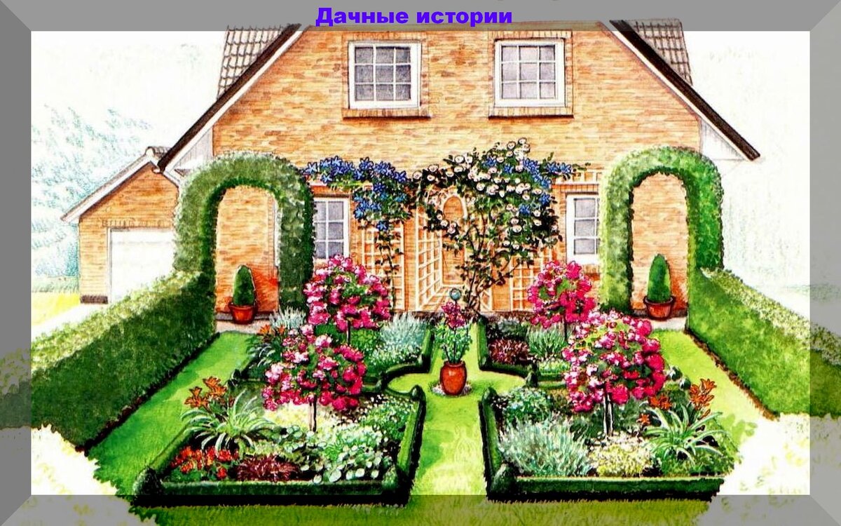 В центре расположится газон с четырьмя одинаковыми клумбами (размером 4 на 3 метра каждая), окруженными бордюром из низкорослого самшита с широкими проходами между ними. В центре этого квадрата можно установить керамический сосуд с декоративным растением, а каждая клумба будет украшена кустом штамбовой розы, окруженной различными многолетниками, такими как шалфей и астра кустообразная.