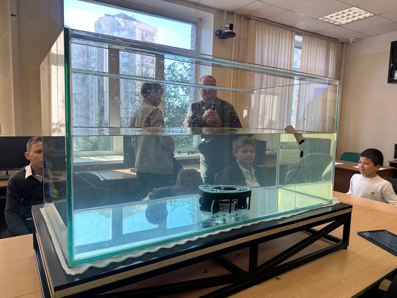 В кабинете технологии школы №14 всё внимание пятиклассников было сосредоточено к большому аквариуму посреди класса. Внутри — учебный подводный робот. На экране за спиной учителя сменяются слайды: устройство аппарата, области применения, реальные примеры подводных исследований.