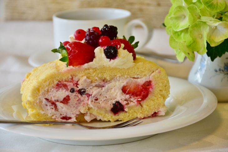 Далее потребуется застелить форму бумагой, вылить на нее заготовку, выпекать бисквит при 180 градусах на протяжении 20 минут. Для начинки нужно смешать сметану и варенье. Полученной массой следует промазать заготовку, после чего скрутить рулет.