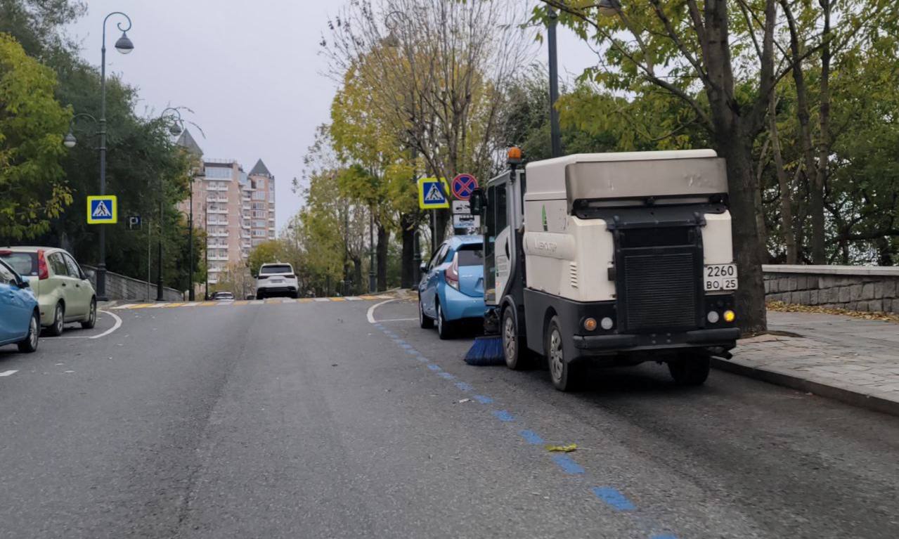 Ленинский район — прометание остановок и тротуаров на улицах Светланской, Семёновской, Фонтанной и Океанском проспекте.