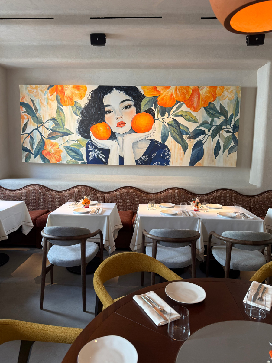 Дизайн Eliso создает атмосферу современной Грузии, которая в последнее время привлекает множество гостей. В ресторане представлена уникальная картина чернобровой девушки с апельсинами, добавляющая визуальный акцент и подчеркивающая культурное наследие страны.