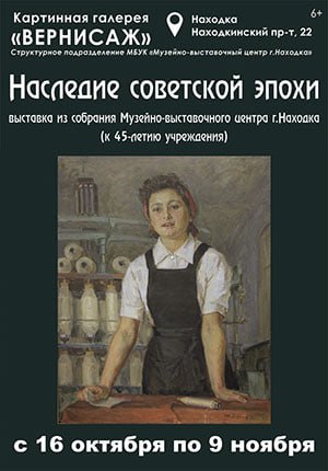 Дорогие находкинцы и гости города! Картинная галерея «Вернисаж» приглашает вас 16 октября в 16:00 на торжественное открытие художественной выставки «Наследие советской эпохи». Мероприятие приурочено к 45-летию Музейно-выставочного центра Находки.
