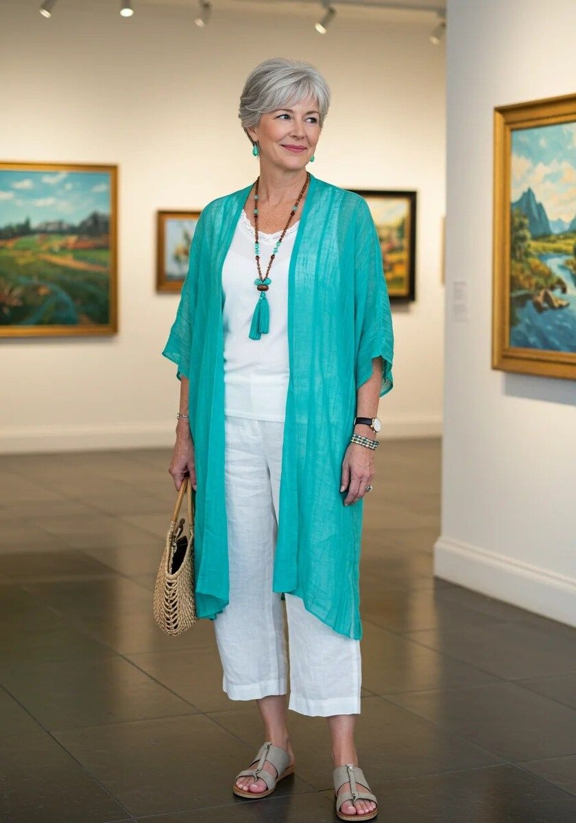 - Летний комплект: Белый шик в виде укороченных широких брюк и свободной футболки из натуральных тканей стильно смотрится в сочетании с легким бирюзовым кардиганом ниже колен. Сандалии на низком ходу и аксессуары в стиле бохо завершат образ.